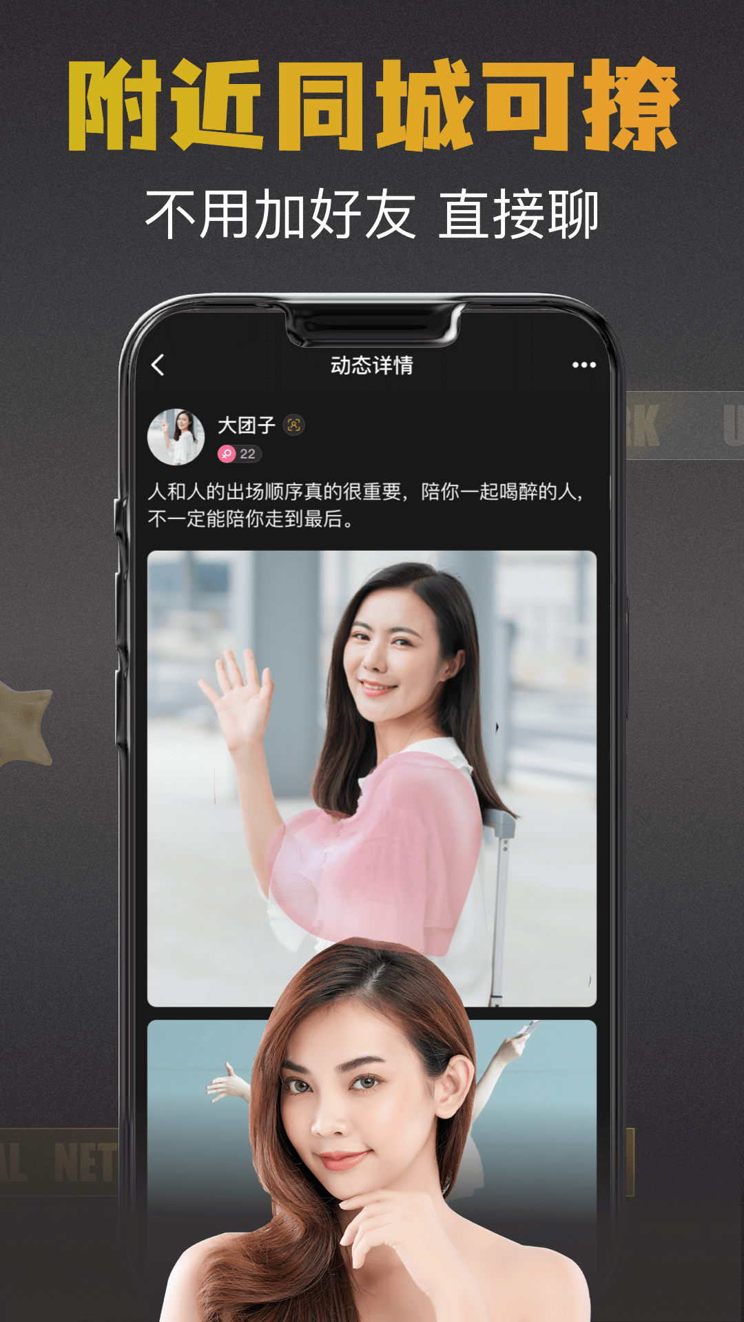 【高颜值群体】虽说好看的皮囊千篇一律,但有趣的灵魂万里挑一。你可以在众多用户里选择令自己心动的她,自己掌握缘分的走向。
