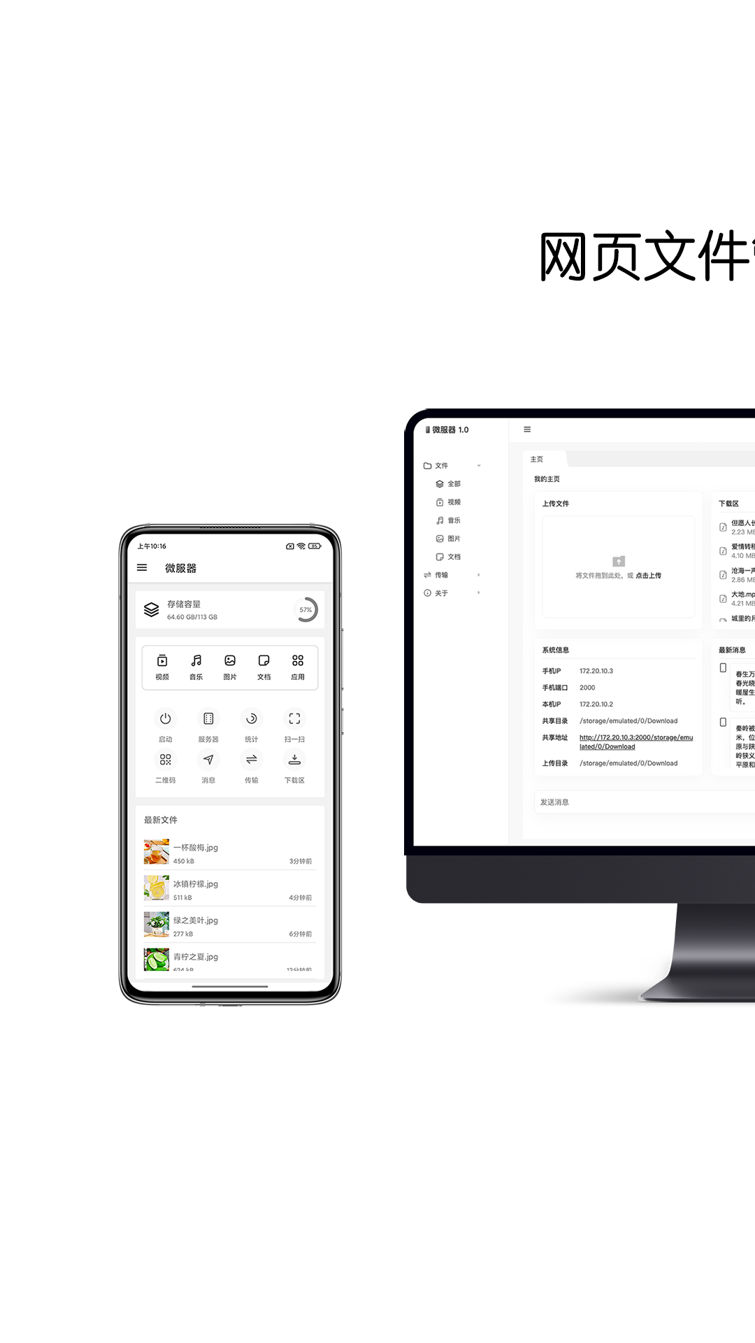 通常情况下,传统的手机与电脑之间传输数据时,要么需要使用数据线,要么要在电脑端安装第三方软件才能实现数据传输。而微服器的主要特性在于,它能够通过浏览器来实现对手机文件的管理、数据的相互传输等功能,从而无需使用数据线,也不用安装第三方软件。