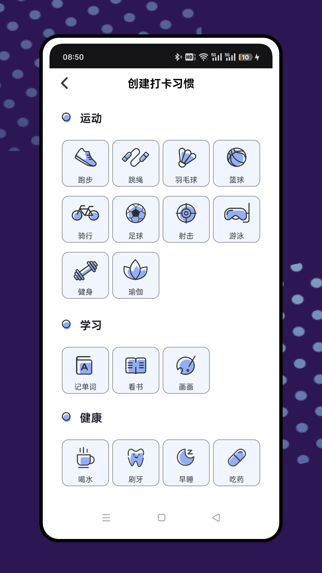 习惯:培养良好的生活习惯,从每天的小事情开始。设定各种习惯目标,并跟踪进度。一目了然地了解自己的习惯养成情况。