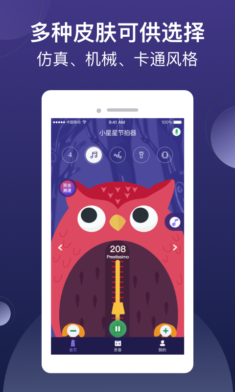 拥有多种可供选择的音色,例如仿真节拍器的声音、木鱼敲击的声音、架子鼓的声音以及人声等。