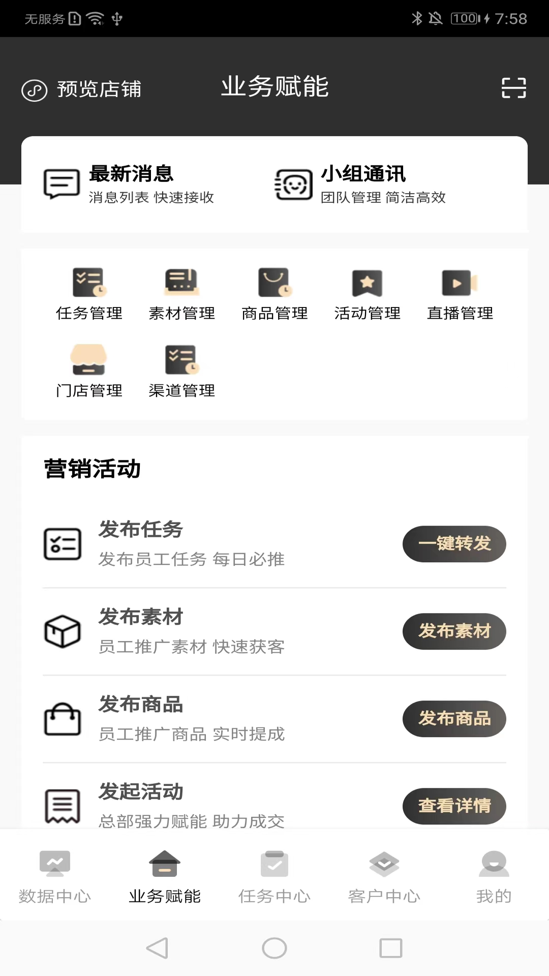 销管家,是一套集合了公私域扩流获客、直播变现、客户招商裂变于一体的营销赋能APP。为品牌方实现了集团化营销赋能、营销流程细节监管、客户流量裂变等全链路营销管理功能。串联了集团各个业务,利用数据去追踪业务行为,真正简便操作且高效率地助力企业落地营销的一套系统。