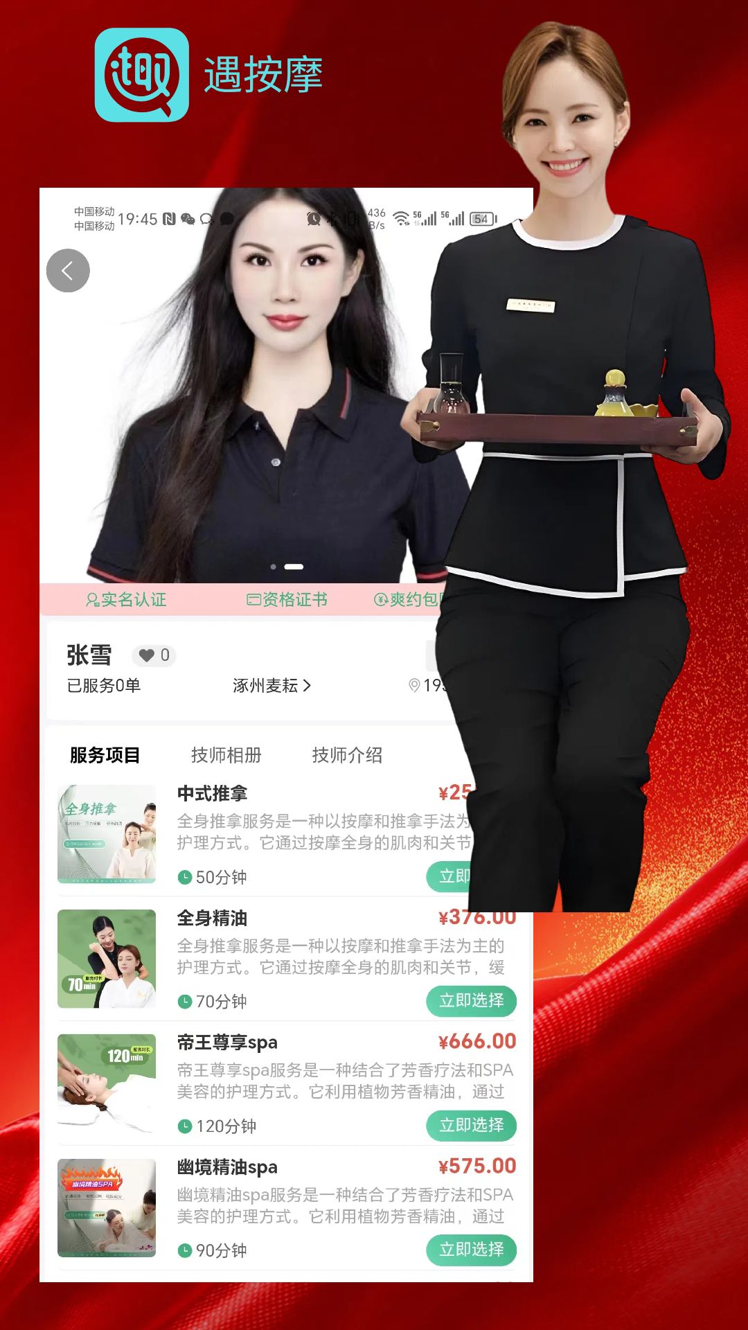 1、平台担保:所有交易均通过了遇按摩按摩平台支付、资金人身安全有保障