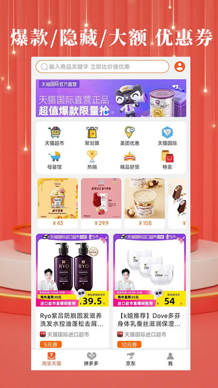 可搜索淘宝天猫、拼多多等平台的商品优惠券,这些优惠券能与满减、平台红包等其他优惠叠加使用,帮您最大程度省钱。