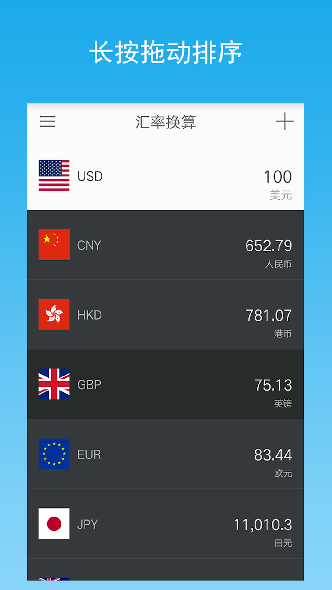 4. 货币排序调整:长按列表中的某一货币并且拖动,就可以重新对货币进行排序。