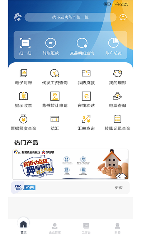 企业手机银行是我行为企业客户打造的移动金融服务平台,7x24小时为企业客户提供全方位、安全、便捷的金融服务。 企业手机银行的打造,可与企业网上银行互联互通,共同构建起立体化、无缝隙的服务渠道,全面迎合企业移动化办公的发展趋势,为企业财务运作开启精益化管理模式。 功能介绍: 企业手机银行分为首页、企业管家、工作台、我的四大菜单。 1、首页:快捷菜单、常用功能、热门活动、公告 2、企业管家:账户服务、对账服务、转账服务、理财服务、代发服务、电票服务、国结服务、贷款服务、客户服务 3、工作台:制单员交易记录、待审核、历史记录 4、我的:登录方式管理、限额查询、帮助中心、联系我们、关于APP、退出登录