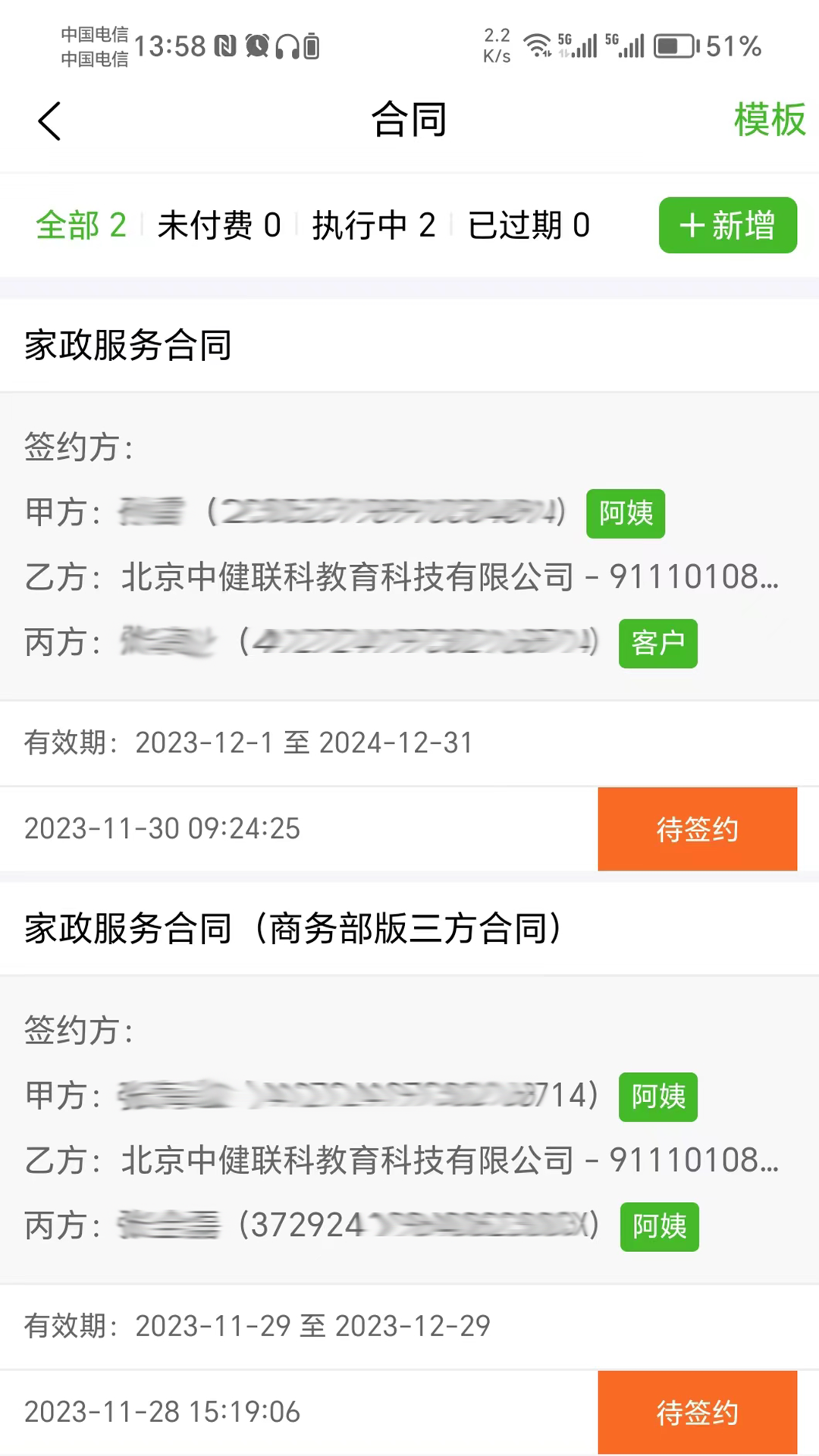 5.电子协议:方便家政机构签订合同,不需要打印,在线即可完成家政合同签订,查询方便,到期提醒。