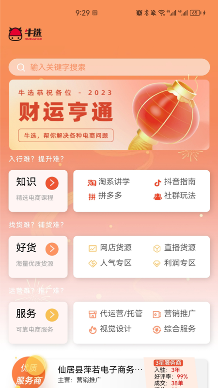 要是你觉得店铺的货源、装修、推广等工作做起来困难重重,就可以利用牛选寻找电商服务。