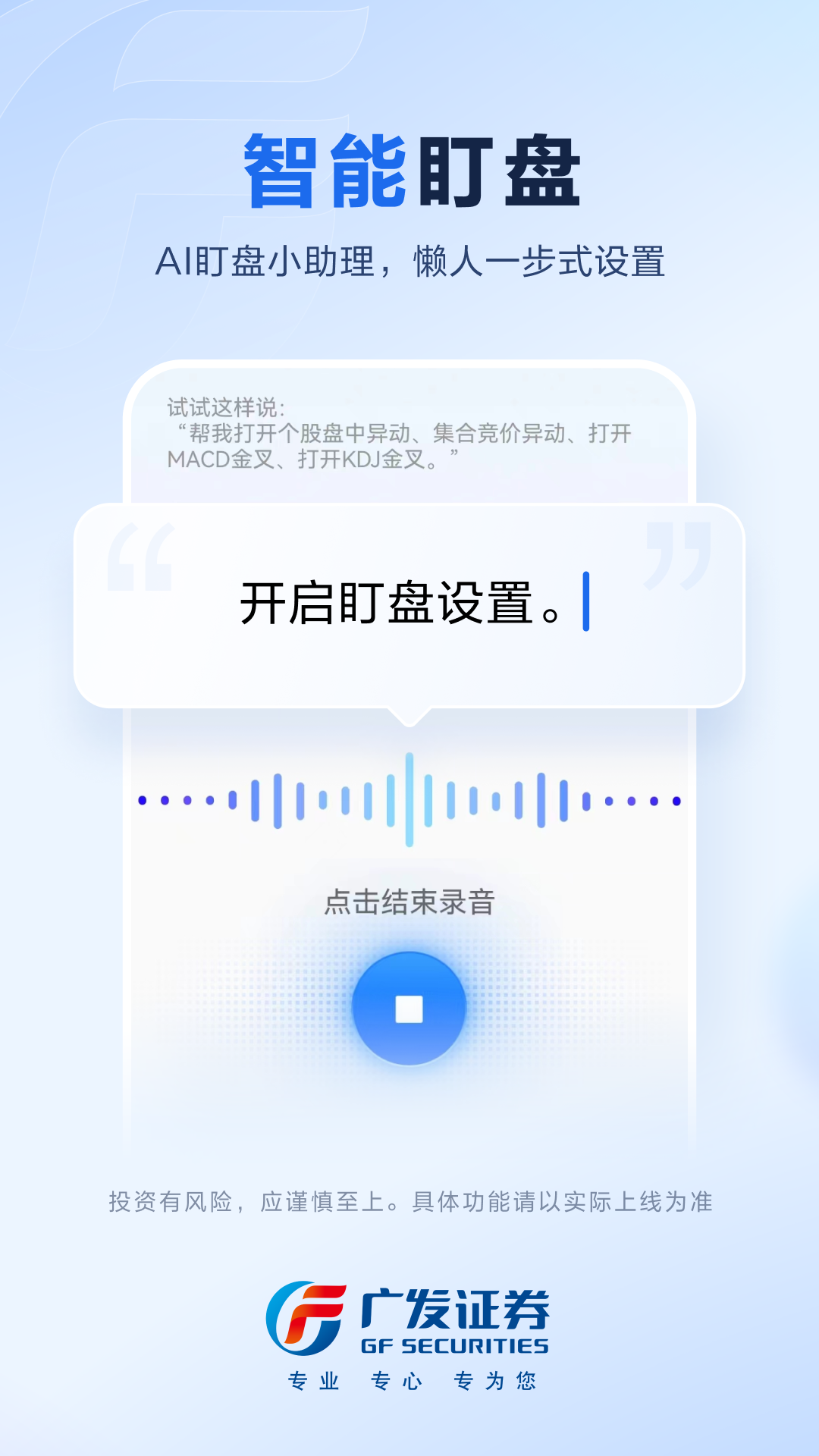 1、【投顾频道】广发投顾,竭诚为您。投资过程中,您可以在这里找到直播陪伴、专业观点、个股诊断等财富管理全方位、个性化解决方案。 2、【智能资讯】整合广发内外部海量资讯内容,基于智能推荐算法,在发现页“推荐”信息流展示更为贴近投资者偏好及市场热度的资讯,打造千人千面的个性化资讯阅读体验,提升时间价值,专注重点内容,您的重点AI懂。 3、【智能盯盘】在“股价预警”的基础上,新增26种盯盘设置,从基本面到技术面,覆盖范围行业领先。支持“懒人一步式设置”,设置盯盘可以交给“一键盯”,结合智能策略算法为每个股票给出针对性的盯盘预设值,还可以将口述语言快速转化为具体的设置值,操作效率全面提升! 4、【智能画线】AI智能识别历史K线形态自动画线,助力投资者更高效地进行技术分析,辅助投资决策。 5、【K线看盘功能优化】K线走势上清晰标注加自选日期,历史关注情况一目了然。均线功能进一步优化,支持多周期均线同屏分析。 6、【社区升级】股吧互动入口优化,显著位置彰显便捷,分享交流一触即达;股吧各场景体验全面升级,全新的股吧、详情页及个人主页场景等您体验。