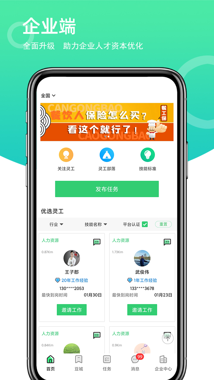 在这个平台上,企业可以不受时间和地点的限制,随时随地发布各种类型的工作任务。平台会依据职业类别,精准地为自由职业者筛选出适合他们的工作任务。而且,它能够对任务的执行过程与结果进行在线监管,让灵活用工方式更加多元化。这有助于企业提高效率、降低成本,同时为个人赋予能力,增加收入,构建起全新的灵活用工模式。