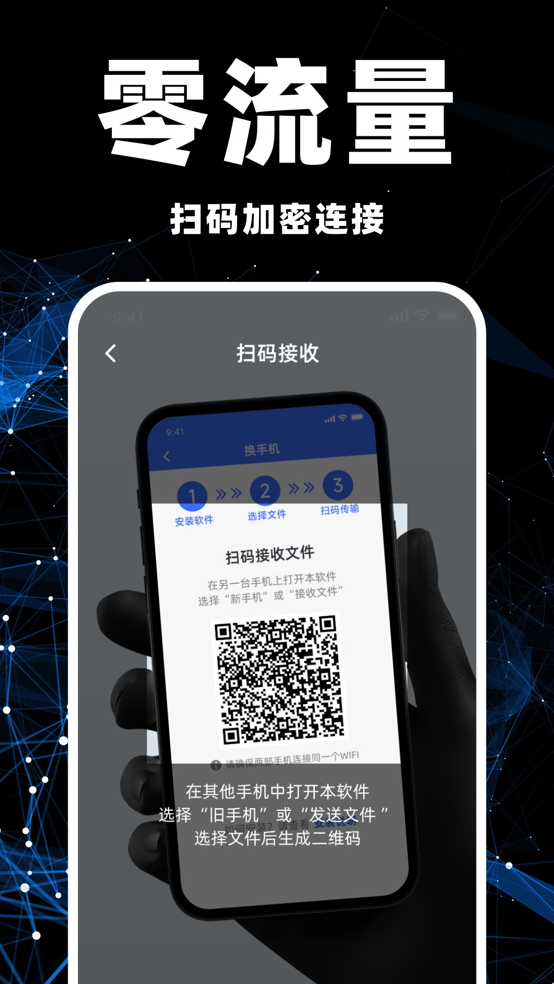 【扫码连接,零流量】不消耗手机流量,无需数据线连接,面对面扫码即传,稳定不掉线