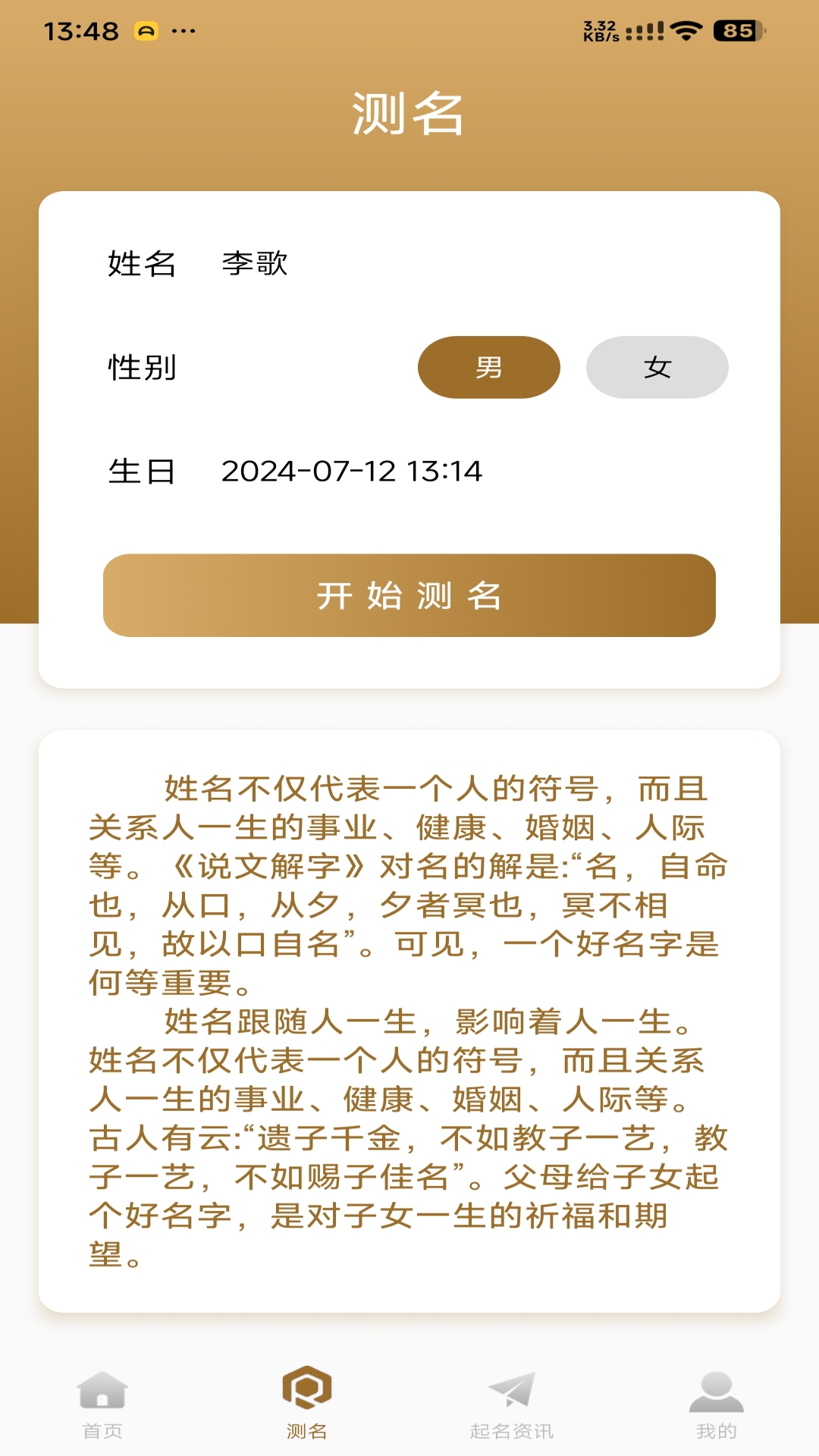 贝壳起名拥有多种实用功能,像是名字解析、名字打分、小名生成等。在使用的时候,您能够依据自身的喜好与需求来进行筛选和排序,自由组合出令自己满意的名字。不仅如此,您还可以查看详尽的名字分析报告,甚至包括未来运势预测等内容。