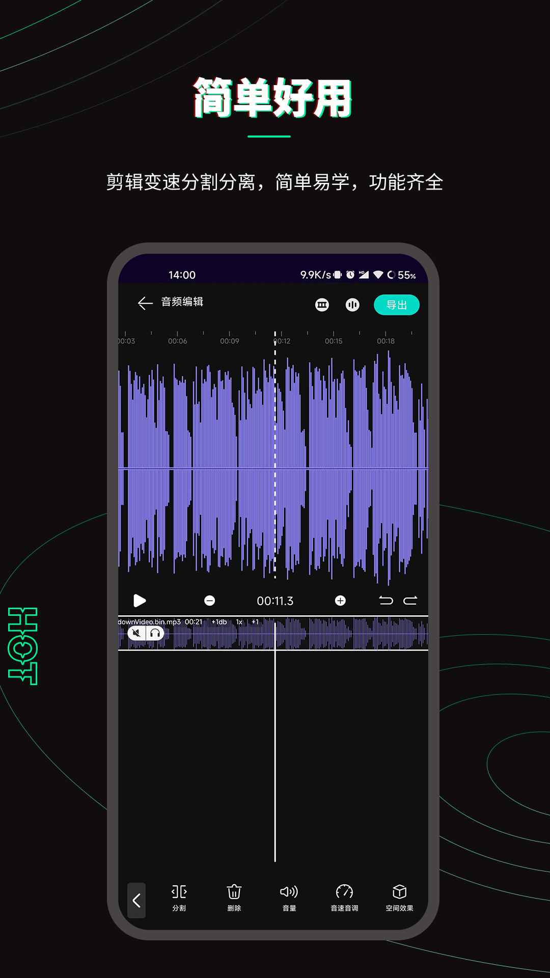 2. 专业音乐剪辑:支持精确到0.1秒的音乐剪辑操作,还具备合并、混音、分割、变声、淡入淡出等高级功能,让您轻松搞定手机铃声和音乐的制作。
