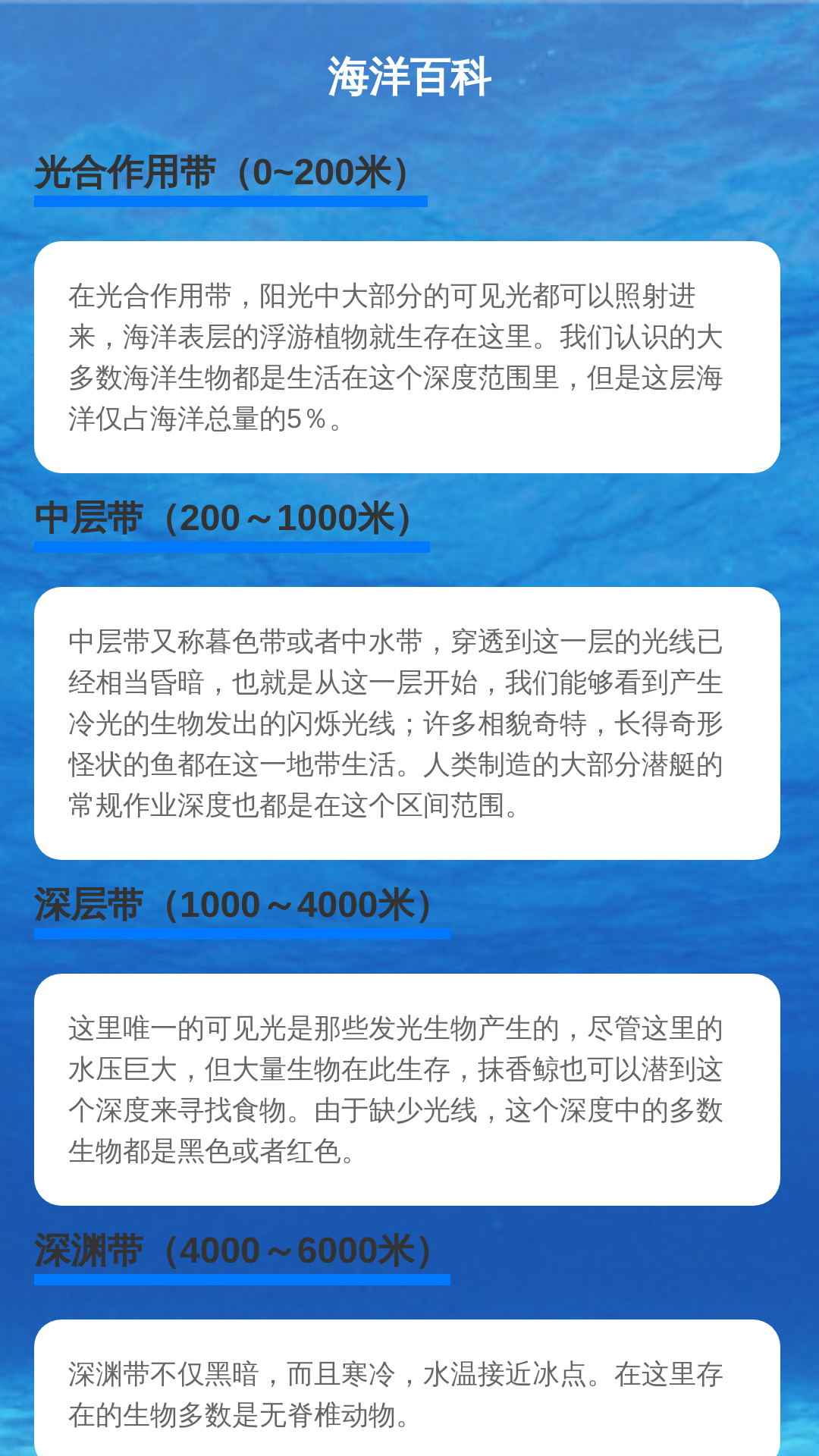 【百科】此功能包含海量的海洋知识,并且运用图文并茂的方式展现各种珍稀海洋动物的保护现状。用户可随时进行浏览学习,这样能够加深他们对海洋以及海洋生物的认知,提升对珍稀动物的关注程度,进而吸引更多的人参与到保护珍稀海洋动物的行动中来。