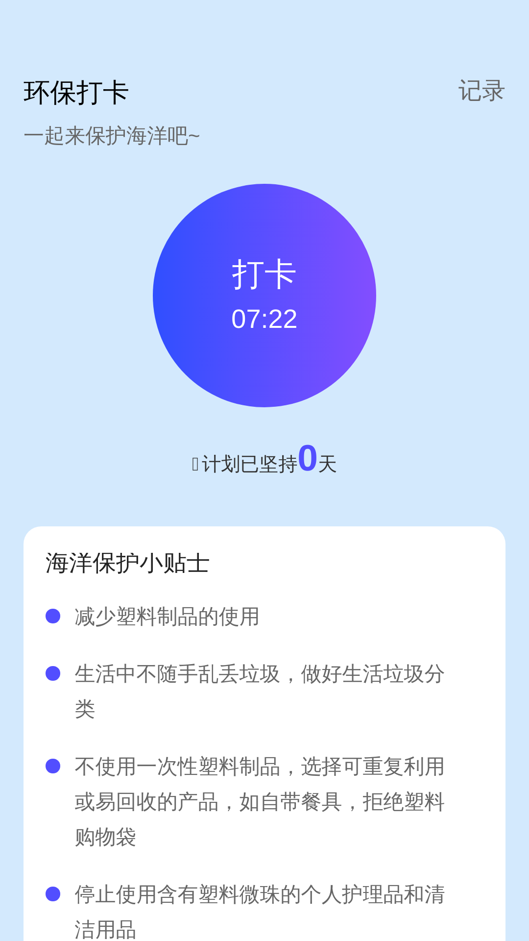 【打卡】在浏览与海洋保护相关的小知识时,用户能够知晓一些简单易操作的环保措施,从而增强自身的环保意识。用户还能自行设定环保打卡任务,像减少塑料制品的使用、参与海滩清洁活动等,并每天进行打卡记录,借此养成良好的环保习惯。