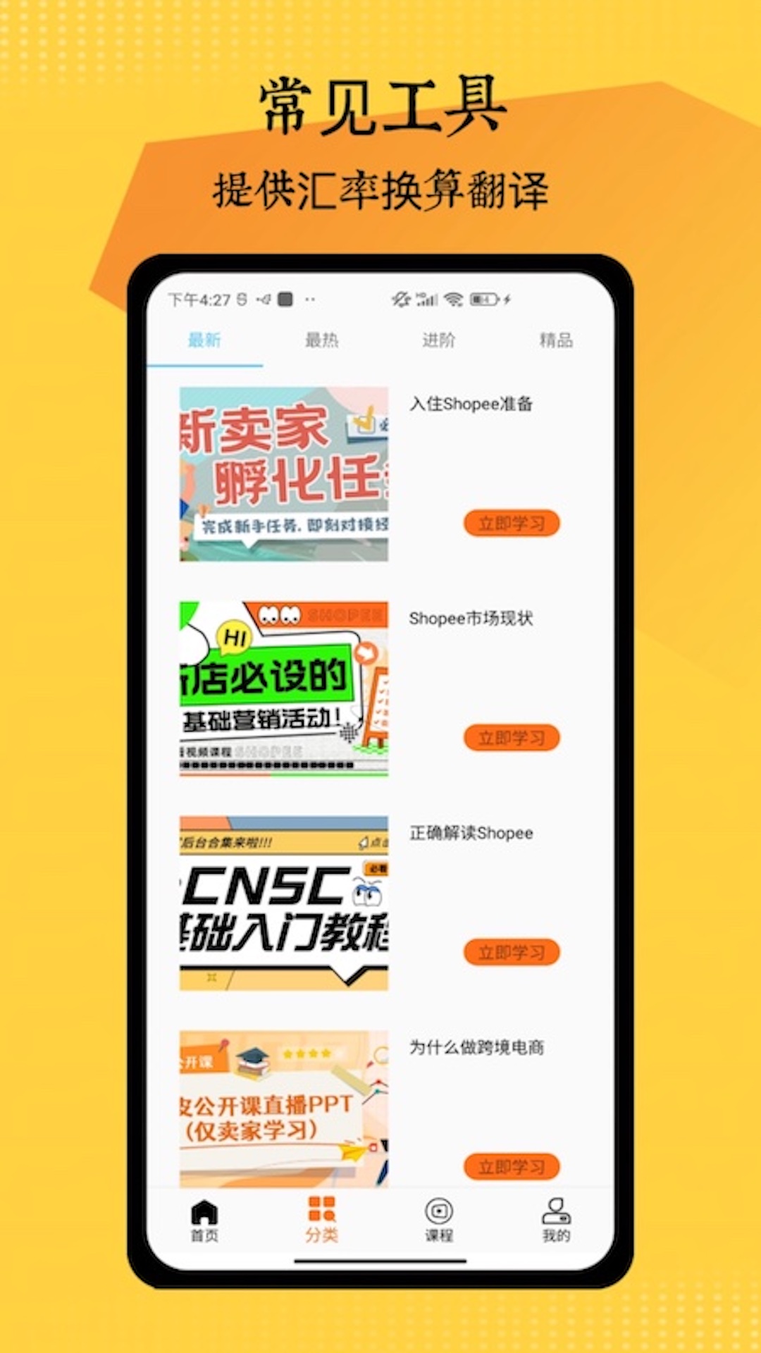 学跨境,做跨境,全面梳理跨境知识体系,系统学习各知识点;精品视频课程,跨境外贸运营、业务、营销、供应链课程内容,同时还提供汇率换算、关键词热度查询等运营实用工具及平台入驻指导服务,帮助shopee电商新用户轻松实现快速上手。