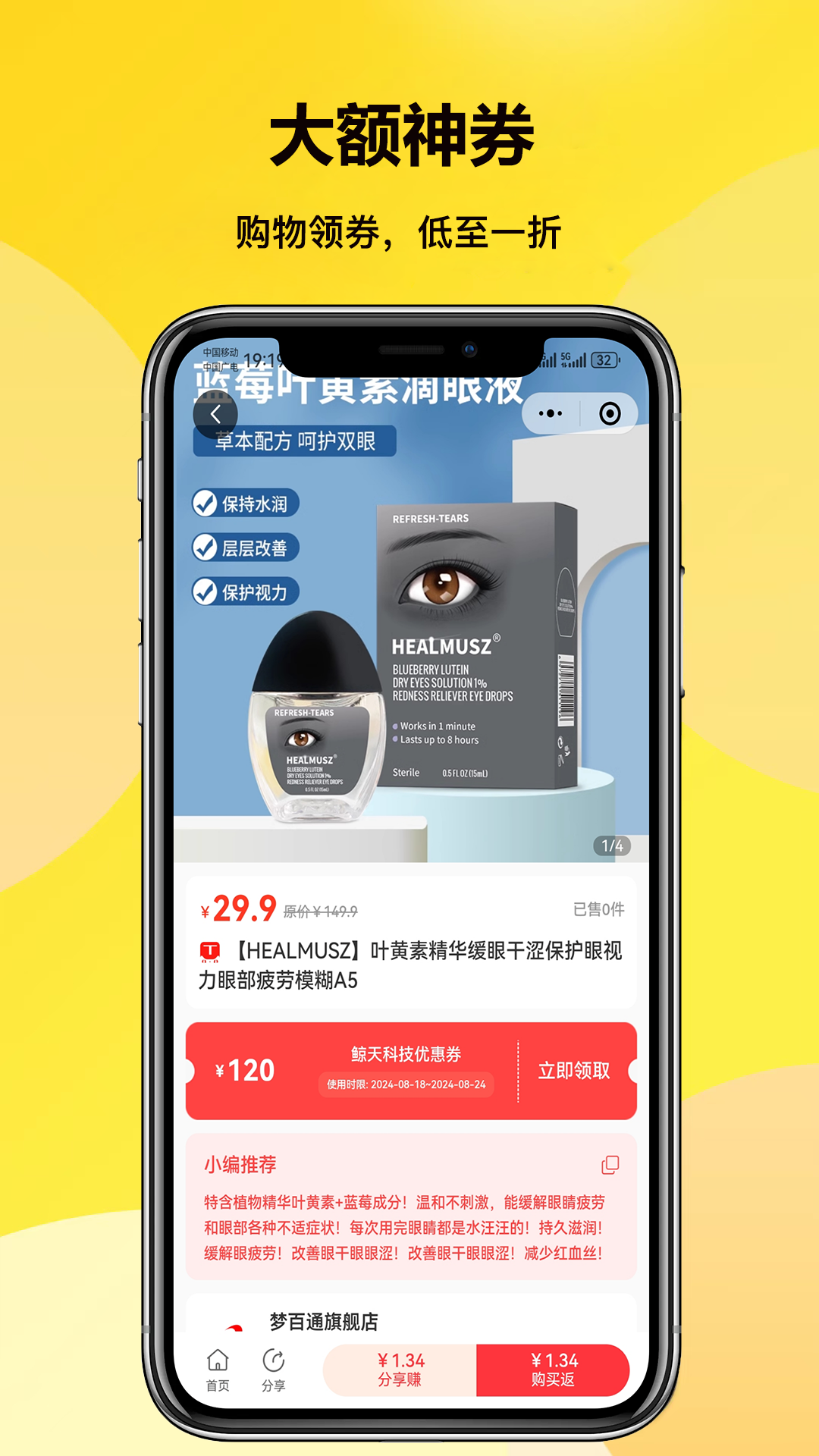 【商品查券】把淘宝、天猫、京东、拼多多商品的标题或者链接、口令复制一下,再打开鲸粉惠选APP,它就会自动为您查找商品优惠券和返利信息。