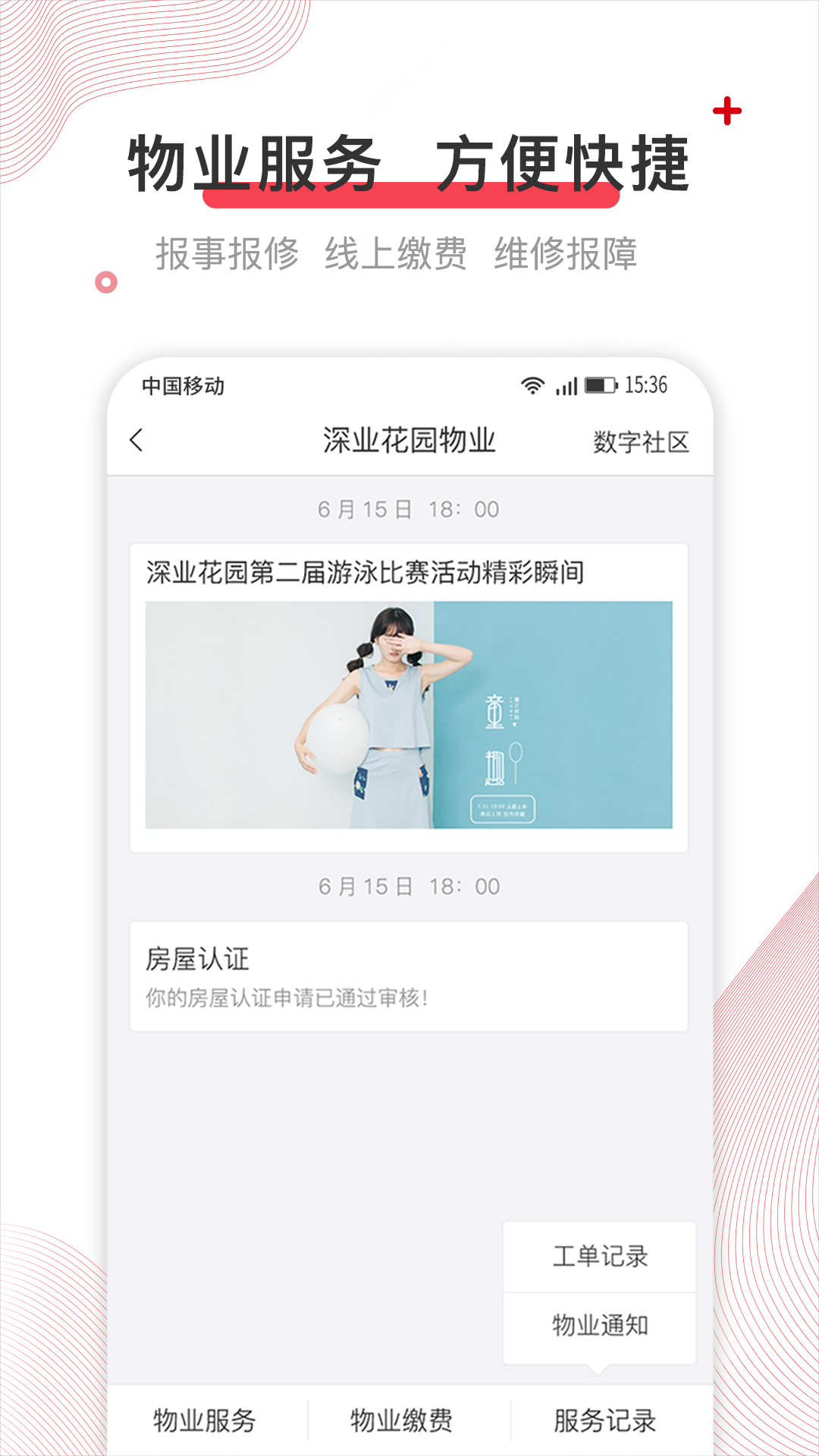 深到家是深业物业运营集团股份有限公司专为旗下各个服务小区打造的多功能APP。这个APP集报事报修、在线缴费、门禁系统、满意度调查以及信息发布等功能于一身,是一个专注于智慧社区建设的服务平台。业主在完成认证之后,就能享受到物业所提供的诸如手机开门、维修报障、物业缴费等便捷服务。