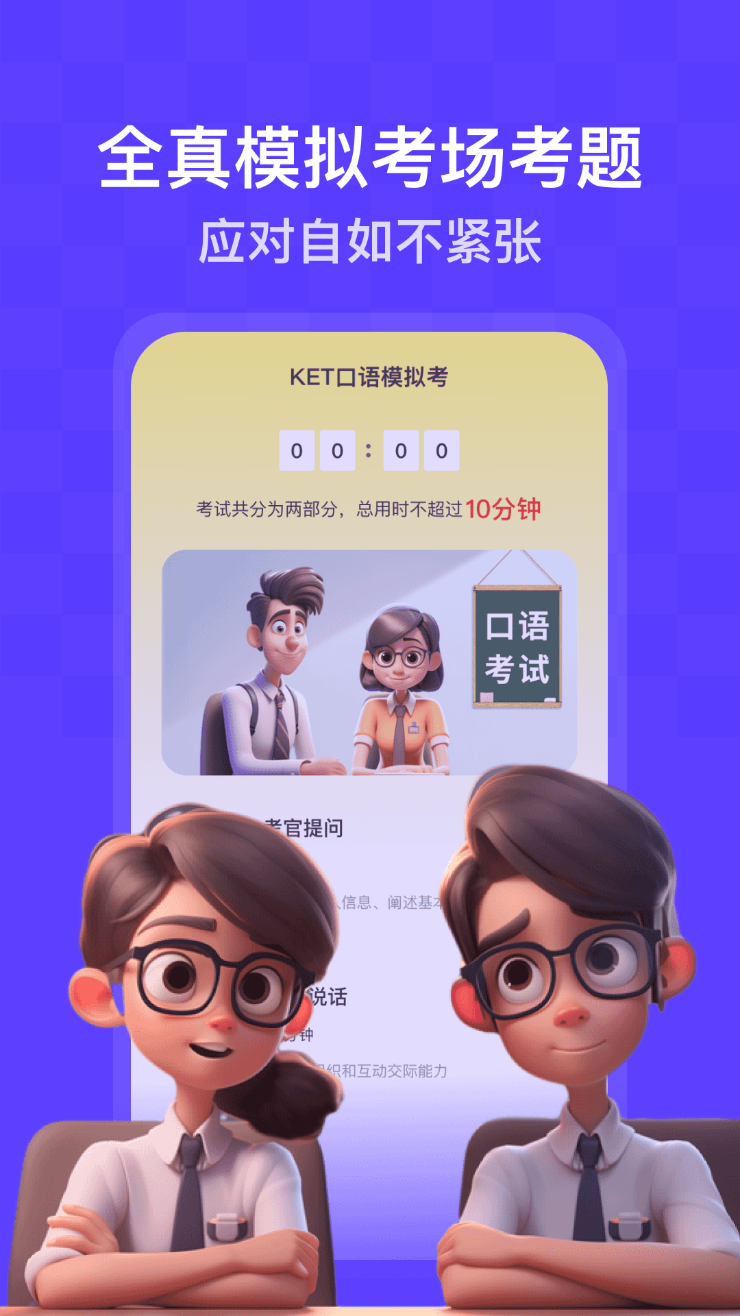 口语精灵专门为KET考试打造全真模拟考场练习,让孩子熟悉考试流程,从而在真正考试时能够从容不迫,轻松应对考场环境。