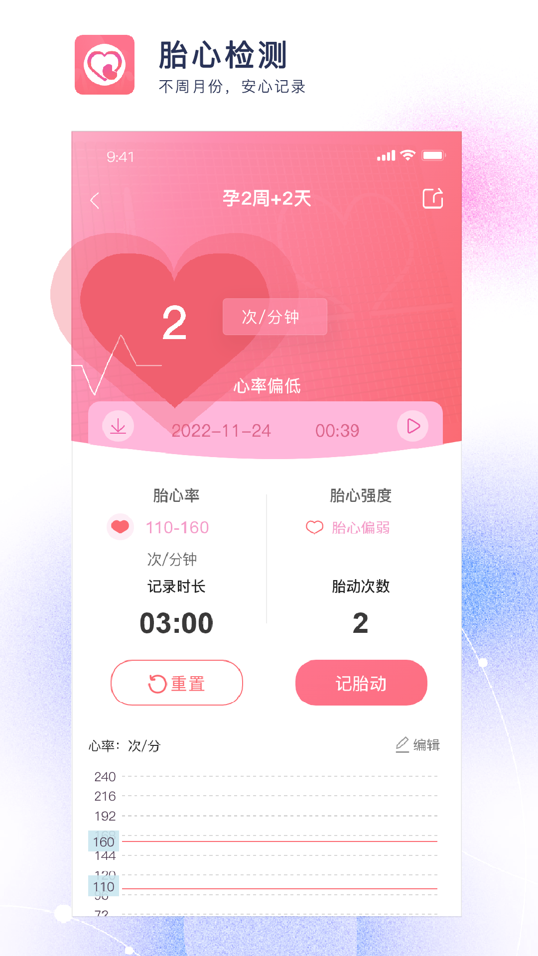 在这个App里,用户能够为宝宝填写昵称。只需选择预产期、末次月经信息,就能轻松计算出宝宝的出生时间,便捷性十足。当与相关设备连接后,可对胎儿进行胎心率、胎心强度检测,记录时长、胎动次数,还能获取心率图等信息内容。对于已经记录的测量数据,能够在页面上轻松翻阅查看。并且,用户还可以下载胎心音频,再添加自己喜爱的背景音频,将其留存以作纪念。