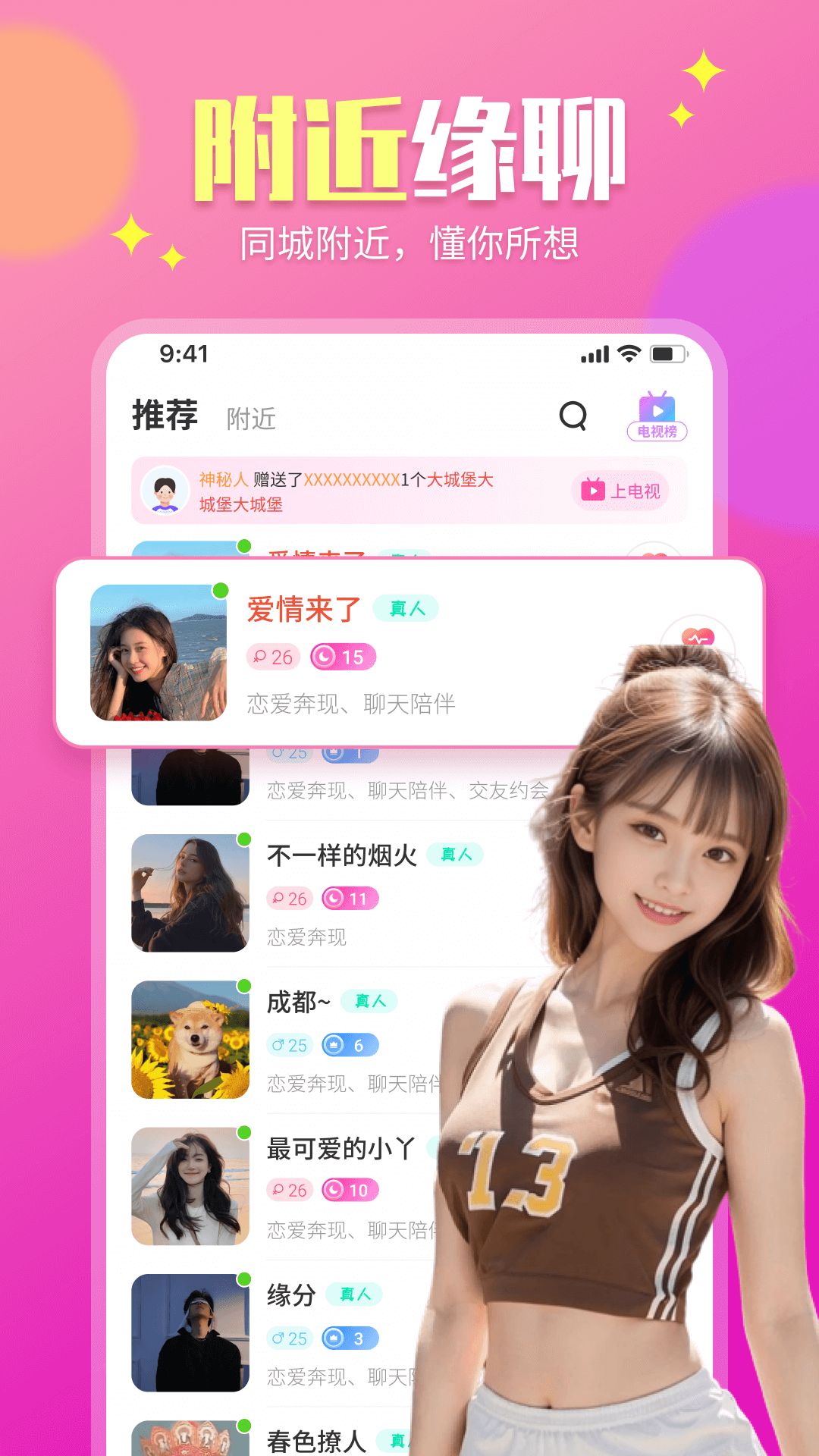 同城附近陌生人,交友、聊天、视频交友、语音交友、约会、恋爱、附近聊天分享的交友平台,为同城附近陌生单身男女量身定做的聊天交友社交软件,同城交友,同城聊天,同城约会,同城匹配,时下单身男女追求的聊天交友约会场景,不管异地还是本地,只要合适,就能快速互动约会,守护你的另一半,让同城陌生人交友不再是难题!