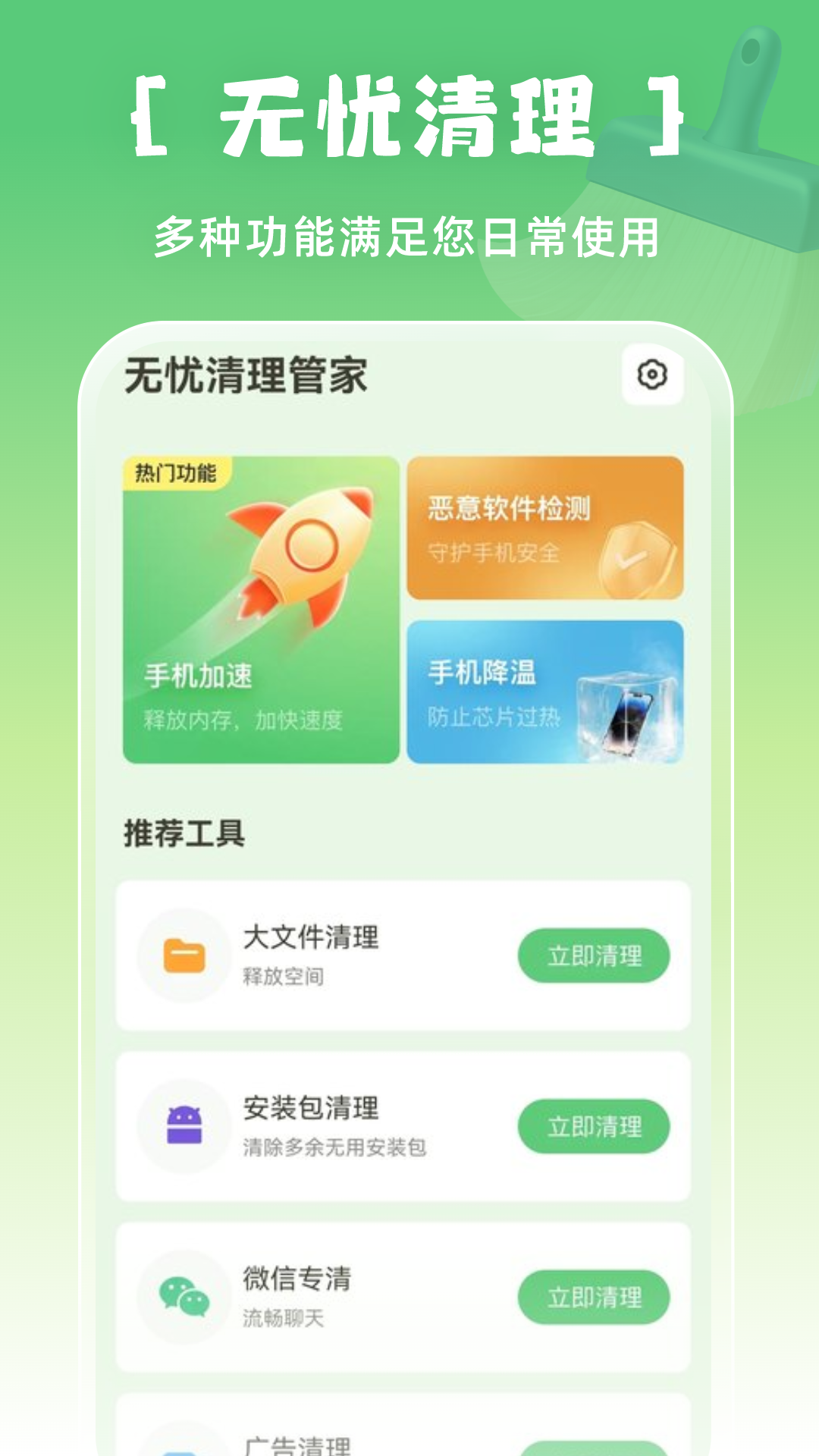 无忧清理管家是一款集成多功能的清理APP,对于手机内各类大文件、安装包、广告插件等都能有效清理,让您无忧清理手机垃圾,轻松搞定手机垃圾问题,让您的手机使用更舒心。