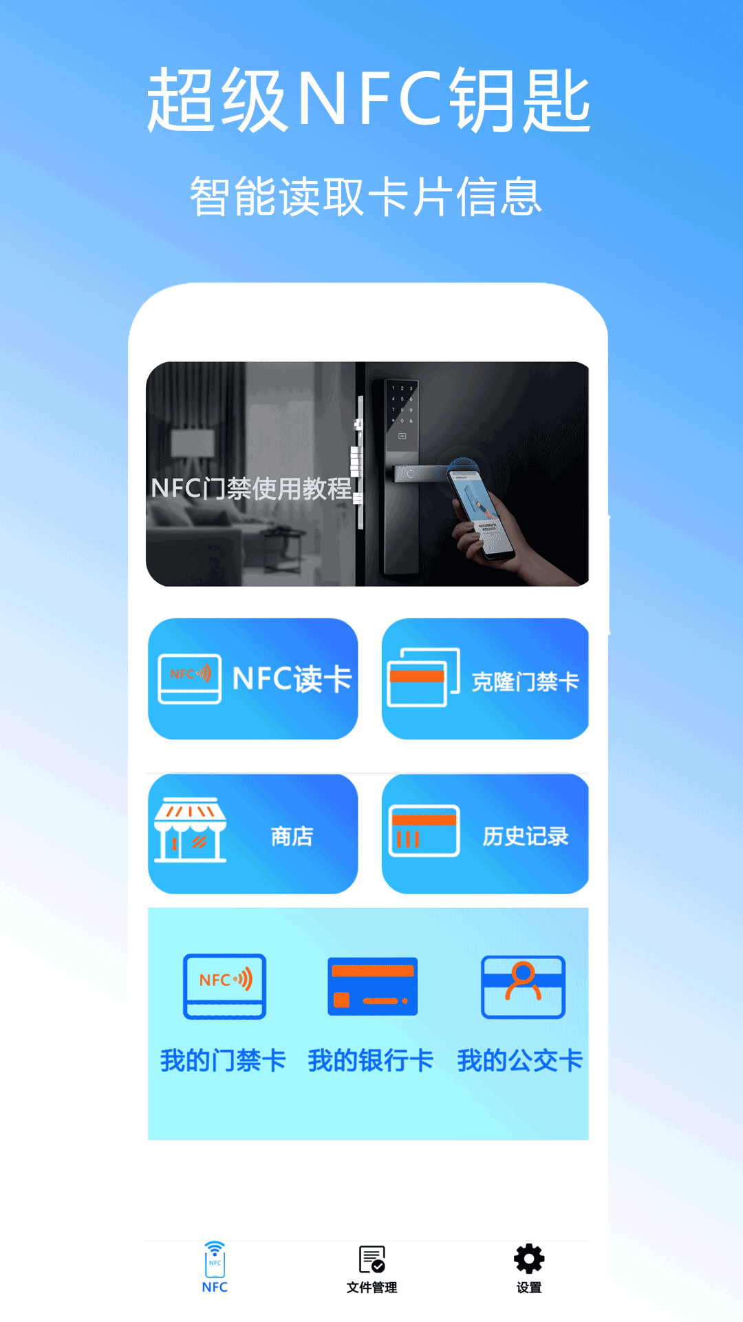 将支持NFC的手机当成借记卡、公交卡、门禁卡等IC卡使用,支持读取、写入,格式化。将相应IC卡中的信息凭证封装成数据包存储在支持NFC的外设中。解决你忘记带钥匙、带门卡的烦恼。把钥匙放进手机。一个APP把你的门禁卡放进手机,方便好用简单轻松,再也不用担心忘记带门禁钥匙