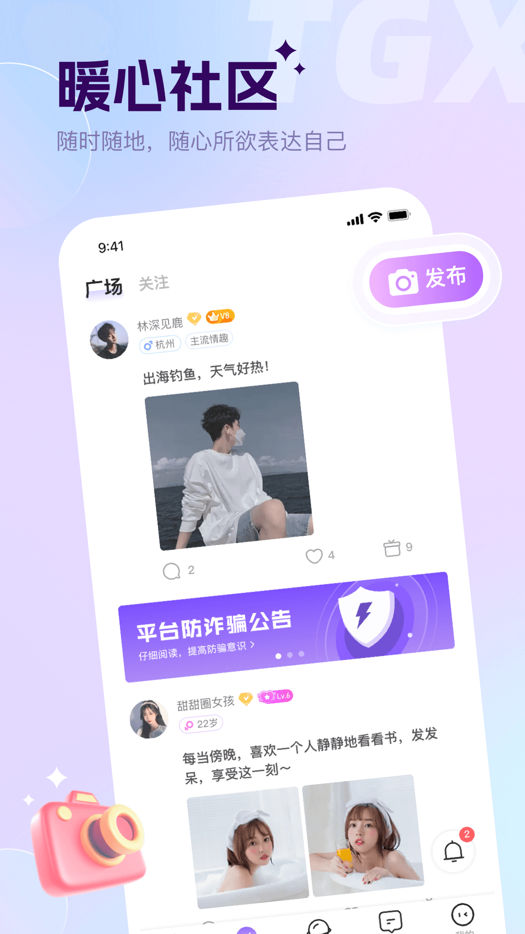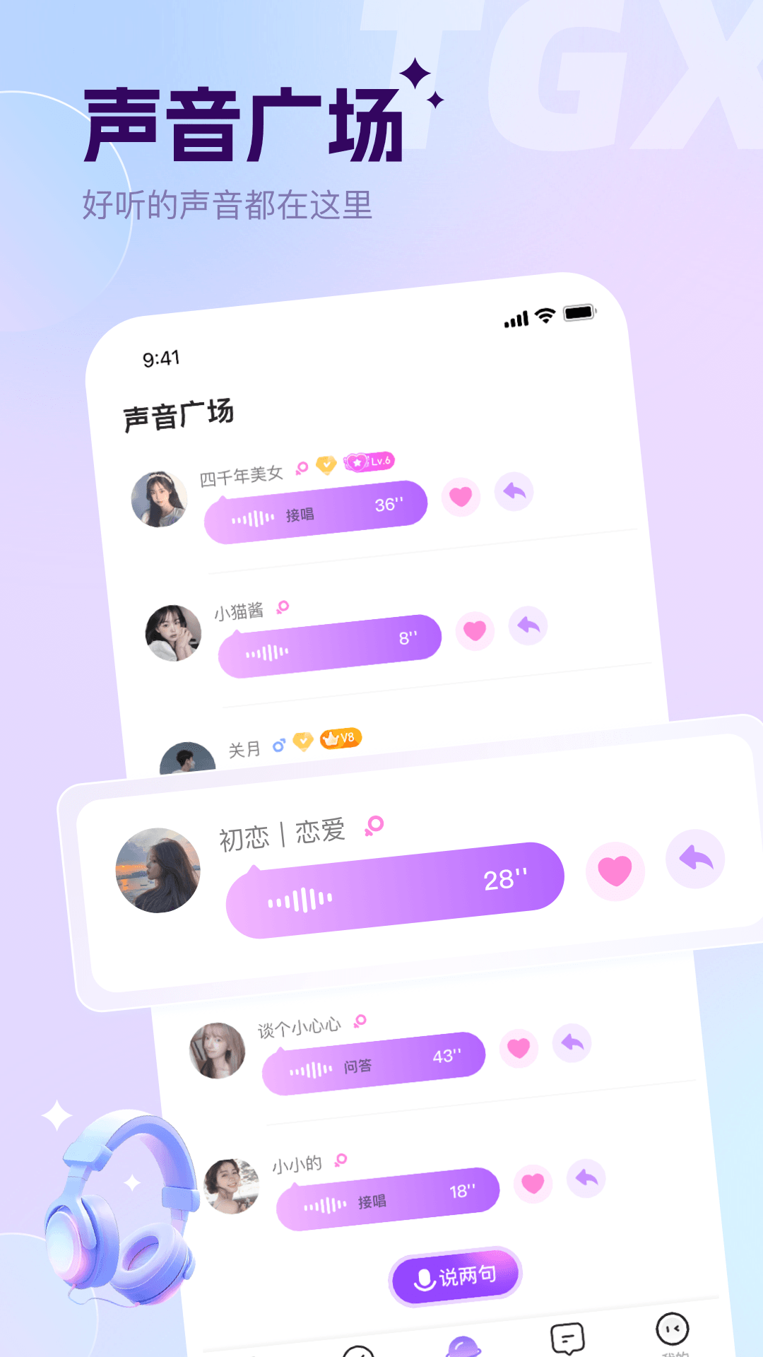 这是一款可以放松无压力的文字语音社交APP,不看脸更不尬聊,分享生活中无处诉说的小想法,展示自己的兴趣。