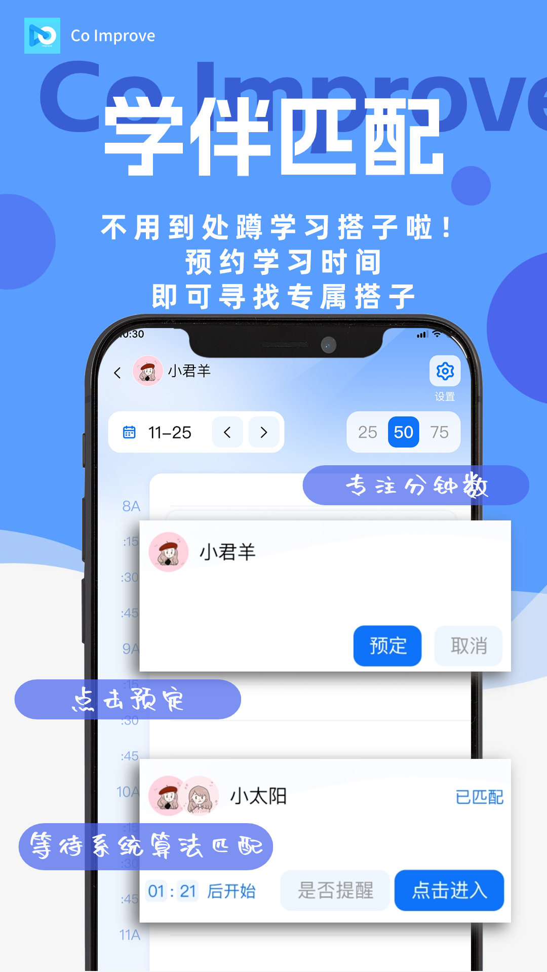 您是不是还在各个平台费力地寻找学习伙伴呢?千辛万苦找到之后,却常常因为学习时间无法同步而不得不放弃组队。在Co - Improve里,这个问题将迎刃而解。我们的产品运用先进的算法(涵盖兴趣爱好、学习类型、学习时间等多种因素),为您精准地匹配一起学习打卡的小伙伴,让您轻松完成在线组队学习。在这里,您能够与学霸自习室里的同学们并肩奋斗,彼此监督学习,从而激发自身无限的潜能。