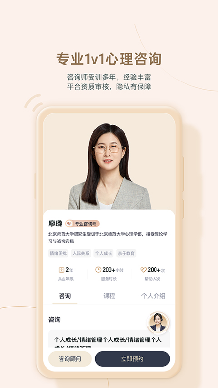 高途心理提供的1v1心理咨询服务极为专业。不管您正被婚恋情感所困扰,还是承受着情绪压力,又或是在亲子关系、职场发展、人际交往等方面出现问题,都可以在这里一键预约专业的咨询师。服务形式灵活多样,线上线下任您选择,旨在帮助您舒缓这些困扰,走向幸福美满的人生。