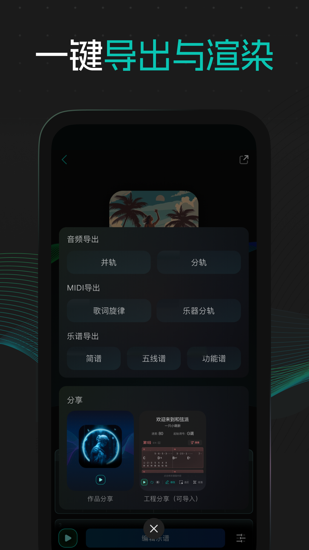 4. 流畅的成果保存与分享:提供云端同步存储、回收站功能保障数据安全,支持作品便捷分享,并可并轨渲染MP3、WAV格式音频文件,分轨导出WAV音频文件。同时可以一键导出词曲或工程MIDI文件,进行宿主级别精调。