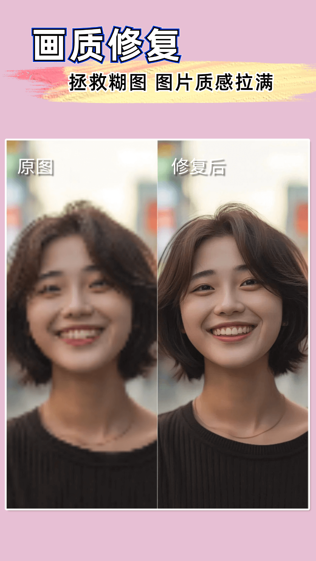 【画质修复】和模糊说拜拜,还原清晰的画面!它能够迅速去除模糊低画质图片中的噪点、优化纹理细节,提升人像质量以及整体画面的清晰度;它还支持修复老照片、低像素图片、被网络和聊天工具传输压缩后的图片、动漫游戏截图、影视视频截图等多种类型的图片。