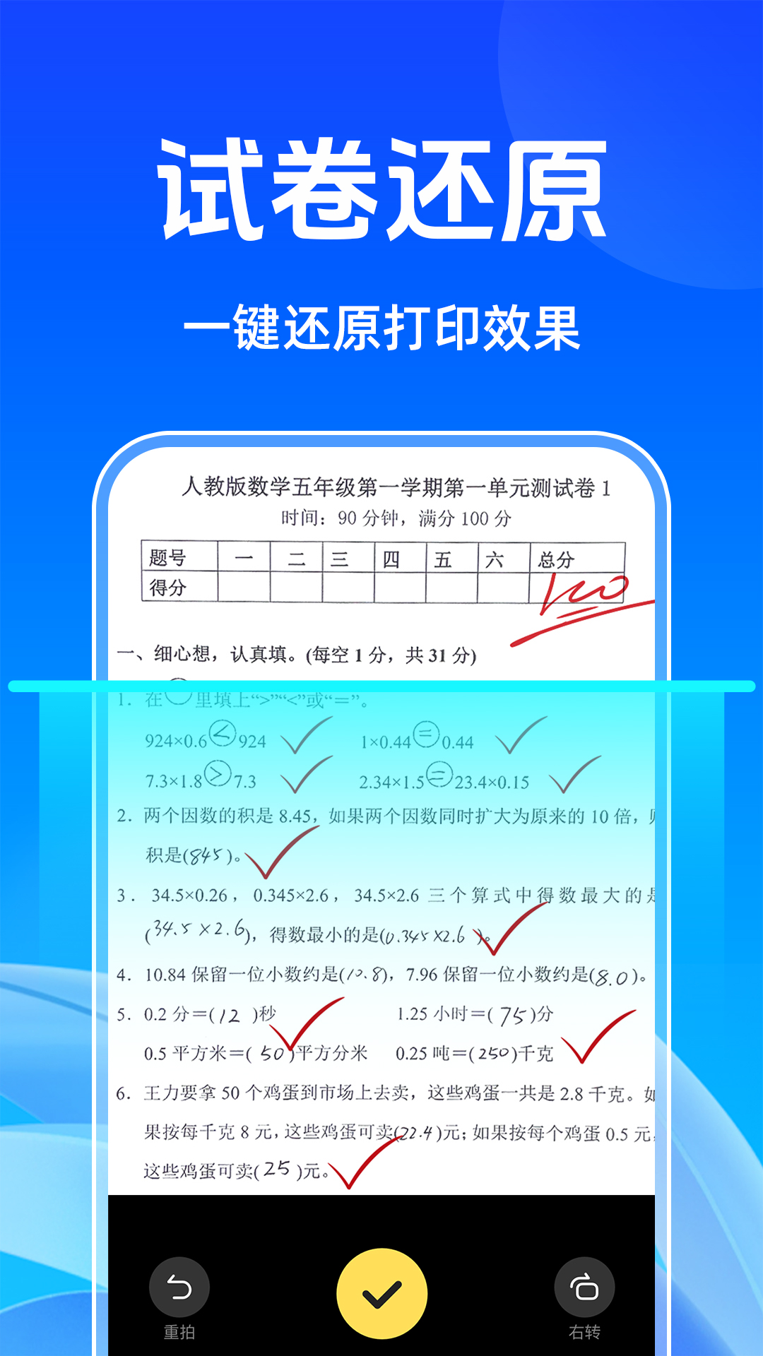 3、试卷还原:将模糊不清的试卷清晰还原,方便进行试卷分析和教学总结。