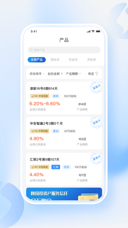 陕国投财富APP是陕国投专为高净值客户打造的线上财富管理平台,为投资者提供产品在线预约、远程双录、电子签约、资产查询等服务功能。