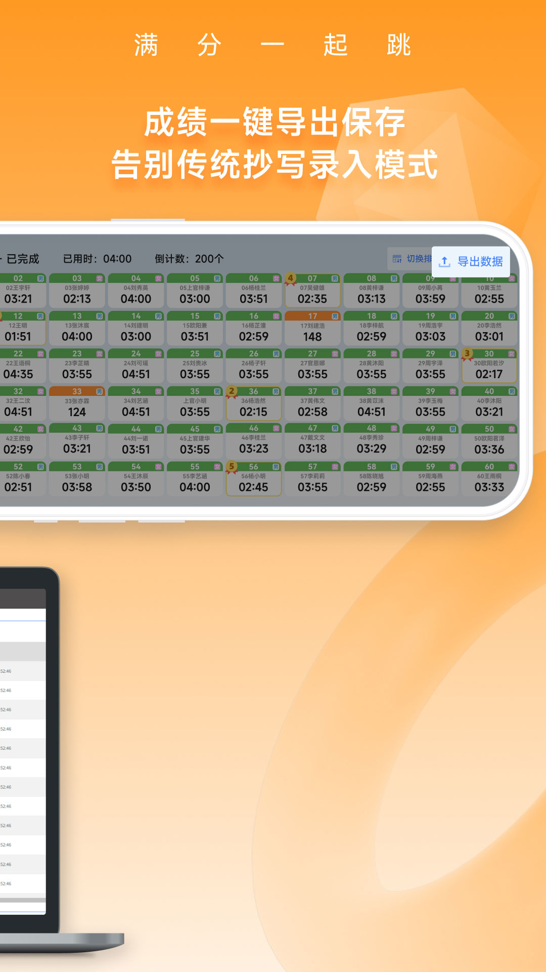 SkipTogether(满分一起跳)是由广东沃莱科技有限公司所开发的多跳绳基站成绩采集系统。该系统融合了物联网技术,能够自动收集多名学生同时进行跳绳考试或者比赛时的数据,然后在服务器端对这些数据开展排名工作,并进行科学的统计分析,从而为老师对学生开展科学的跳绳体测教育提供指导。
