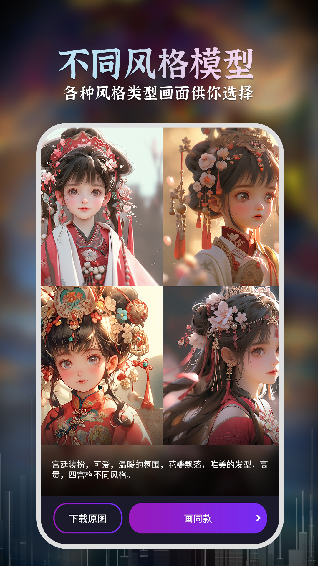 AI绘画大师基于强大的AI技术,可以根据您输入的描述,在一定时间内生成各风格的画作。古风、写实风格、二次元风格、像素风格、概念艺术、未来主义、赛博朋克、巴洛克风格、卡通画、油画等都可以选择。