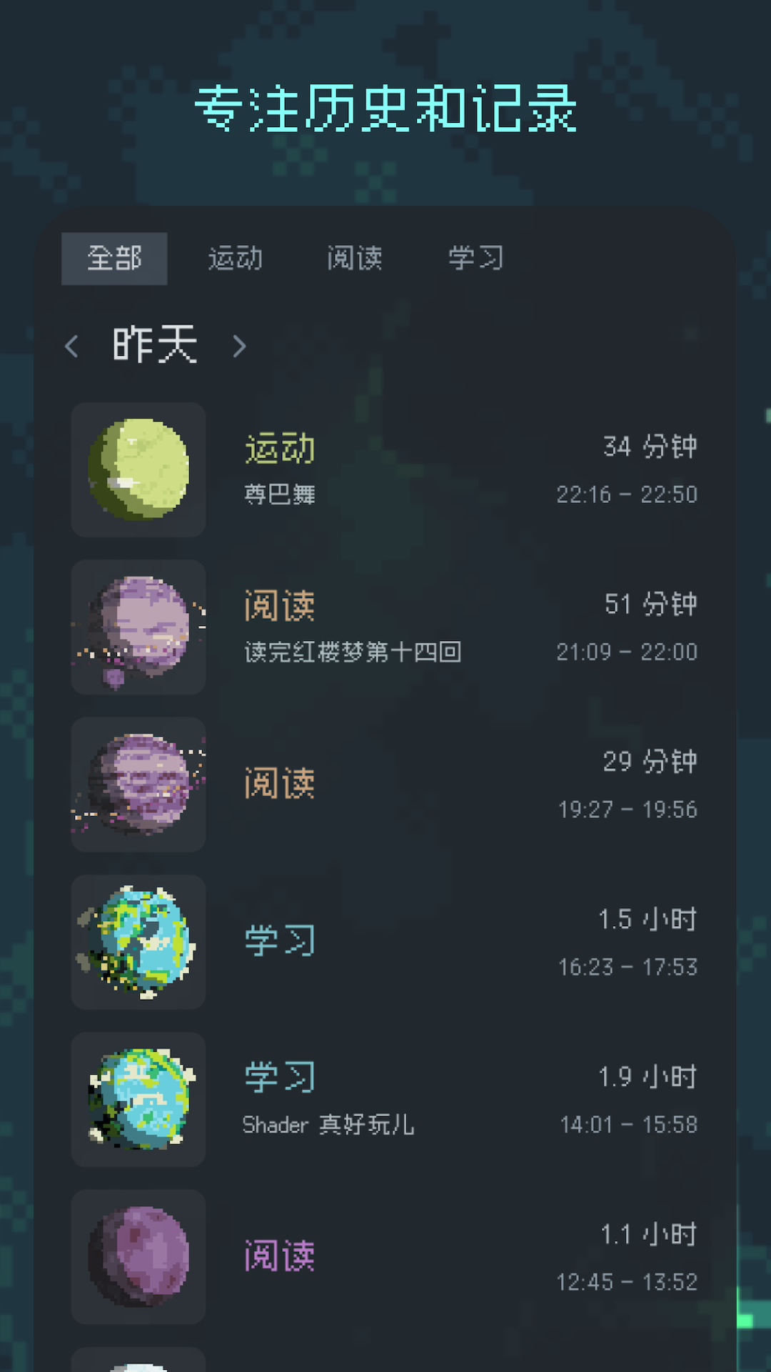 异星专注是一款游戏化的专注计时软件,通过星球的演化具象化专注时间,赋予它宇宙量级的意义感,让你实现长期的无痛专注。