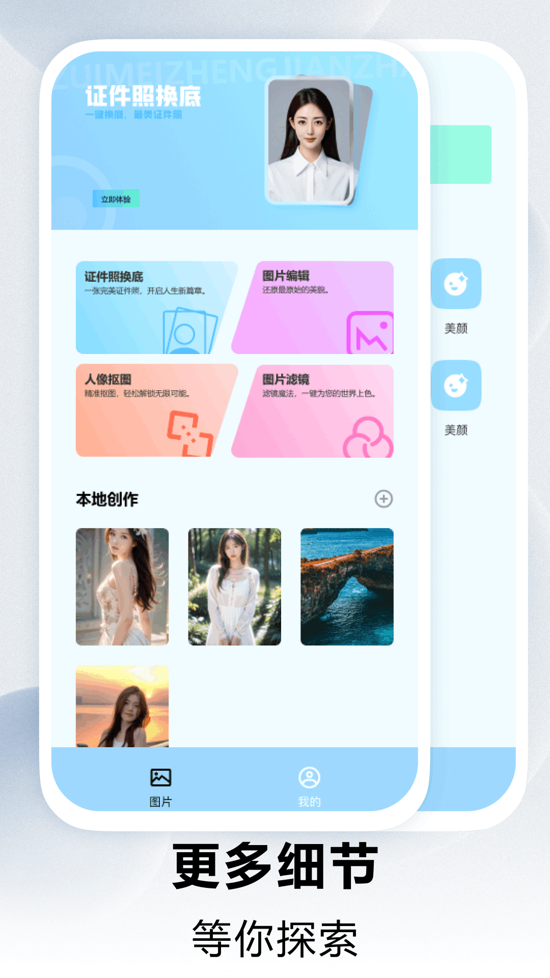 这是一款功能丰富的APP,它具备多种实用功能,例如证件照免费换底色、图片编辑、人像抠图以及图片滤镜等功能。更多精彩内容等您来探索,快来下载体验吧,我们真诚期待您的反馈哦。