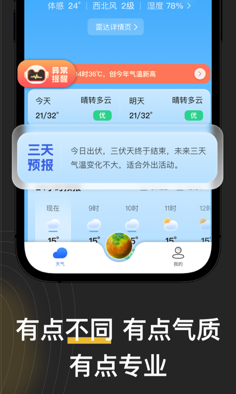 能够实时获取您所在位置的天气预报和空气质量数据,轻松查看当下天气的实际状况以及24小时内的相关数据。