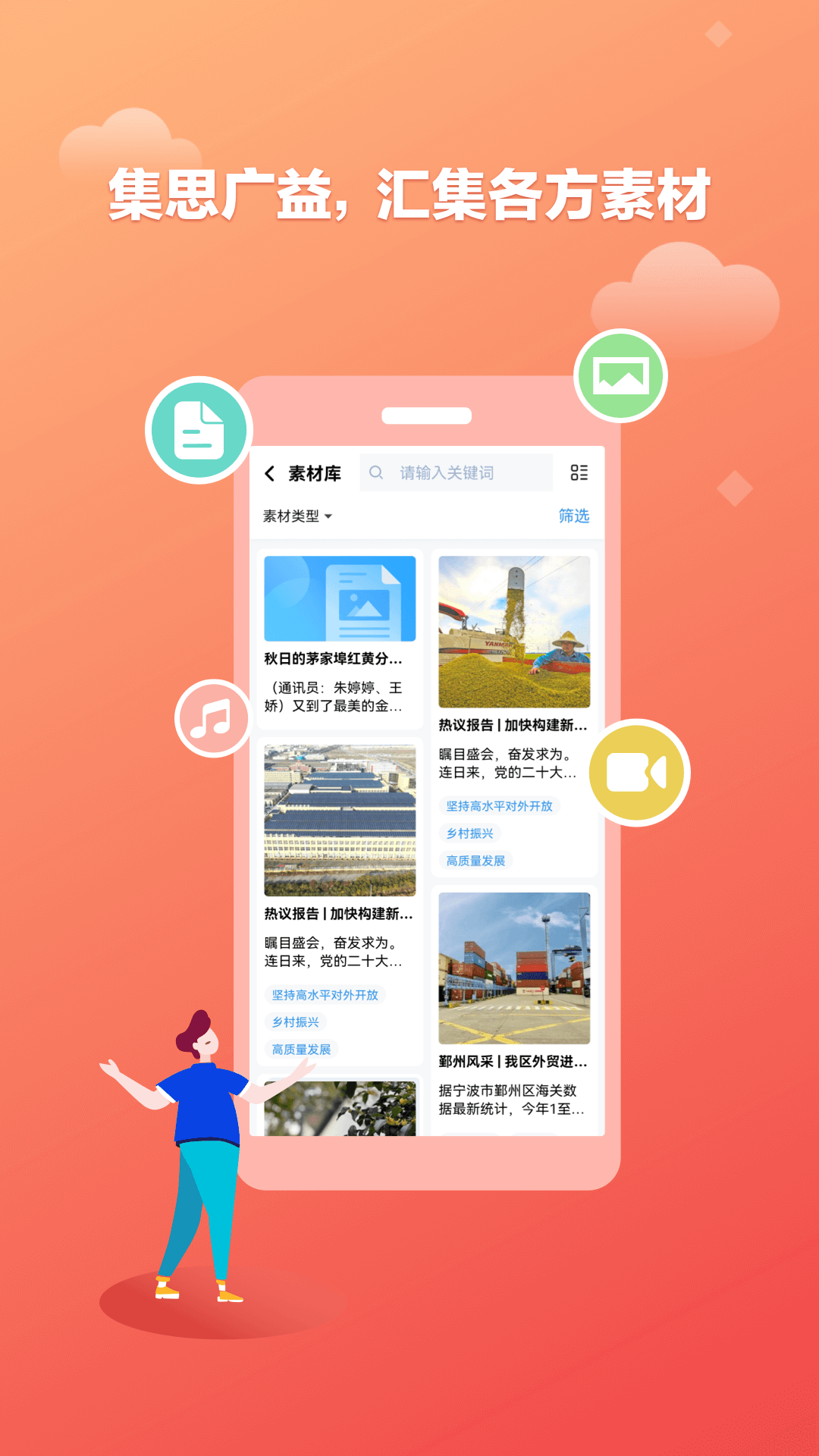 本软件是一款为提升媒体策划、内容协同生产、基层传播效能而开发的应用软件。投稿、征稿、报料、写稿等功能可以让用户便捷地上传各种新闻线索和素材,通过素材库、推荐稿等稿库功能进一步汇集基层媒体的优质新闻素材。