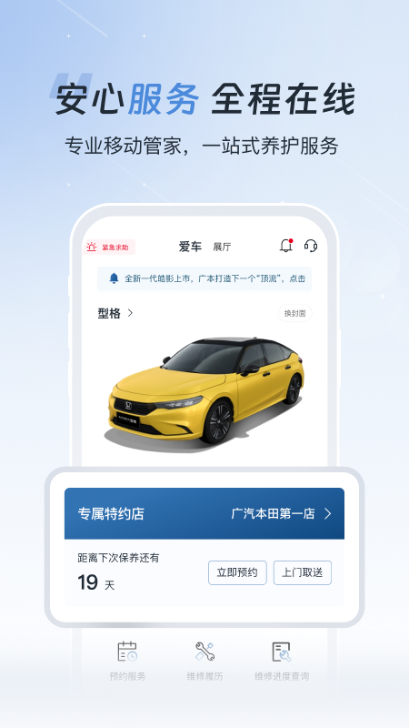 我们提供「安心服务」,您可以在线一键预约车辆的维修保养服务,还能预约上门取送车服务,并且能够实时掌握车辆的维修进度!