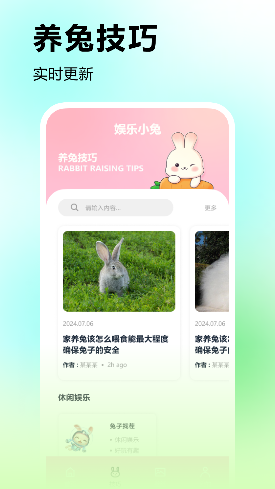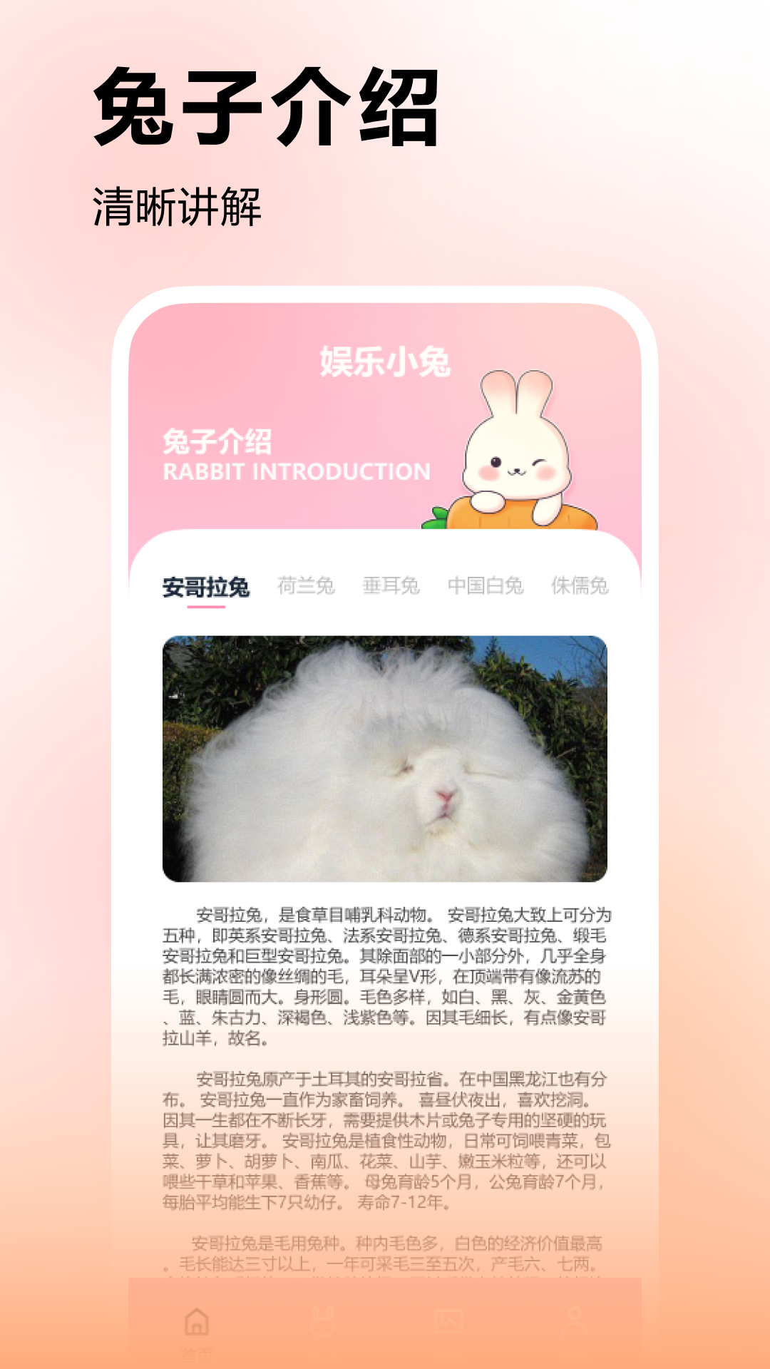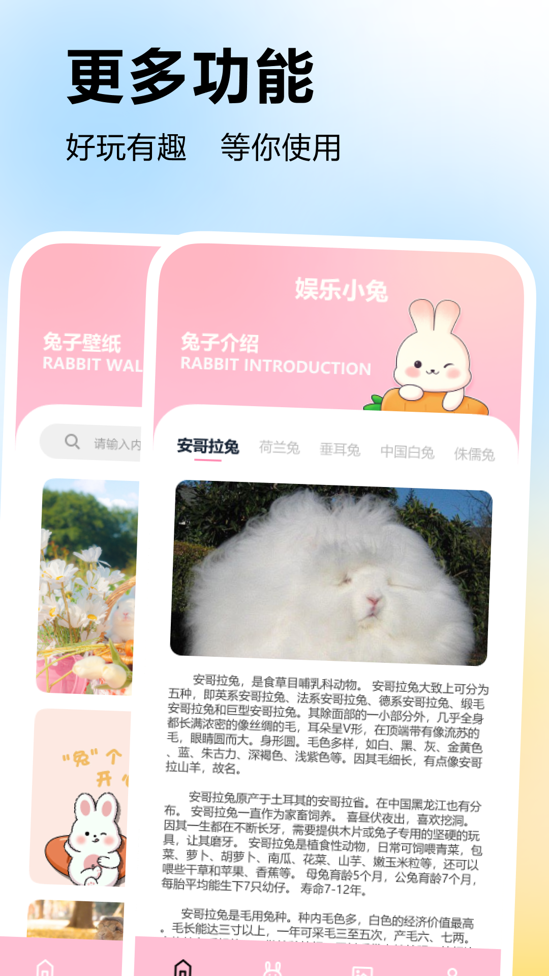 娱乐兔是一款非常有趣的应用呢!它里面搭载了众多不同类型兔子的简介,能让你全面地了解兔子的种类、习性等相关知识。同时,这里还包含了一些喂养兔子的小技巧,无论是新手养兔人,还是已经有经验的兔主人,都能从中获取有用的信息哦。更令人惊喜的是,娱乐兔有许多超级可爱、美美的兔兔壁纸,这些壁纸可以让你的手机或者电脑屏幕瞬间变得充满生机与活力。这里还有更多精彩的内容等你发现,快来下载娱乐兔吧!