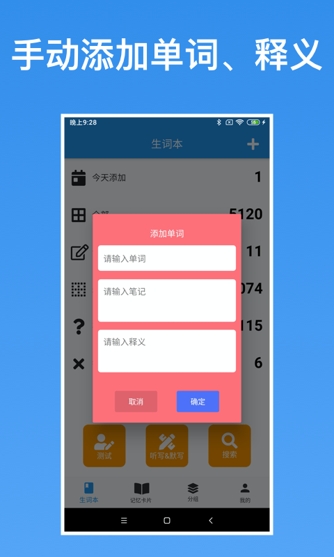 * 「手动添加生词」:可自行编辑单词释义、备注。