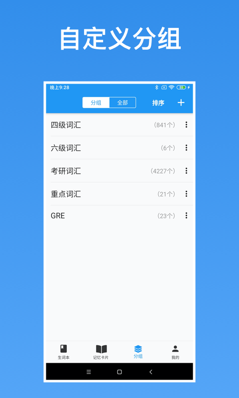 * 「记忆卡片」:自行选择分组,支持多种模式,强化薄弱环节。