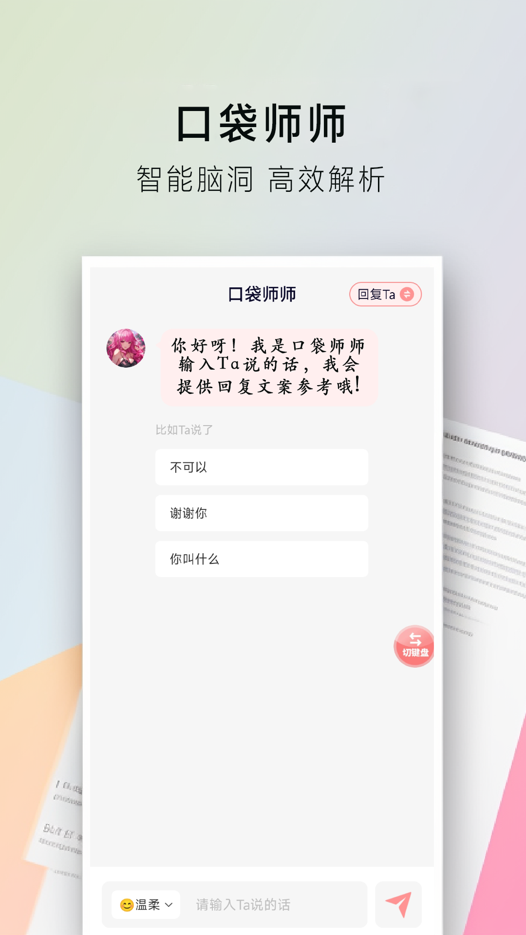 【口袋师师】具备智能脑洞功能,可进行高效解析,为您的聊天提供有力支持。