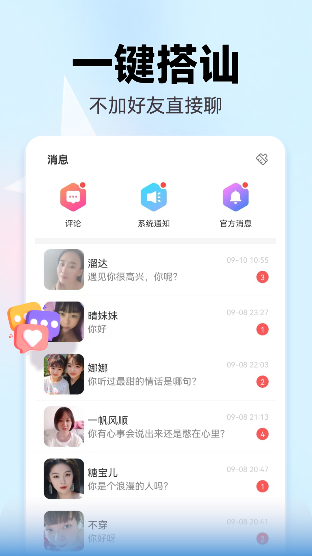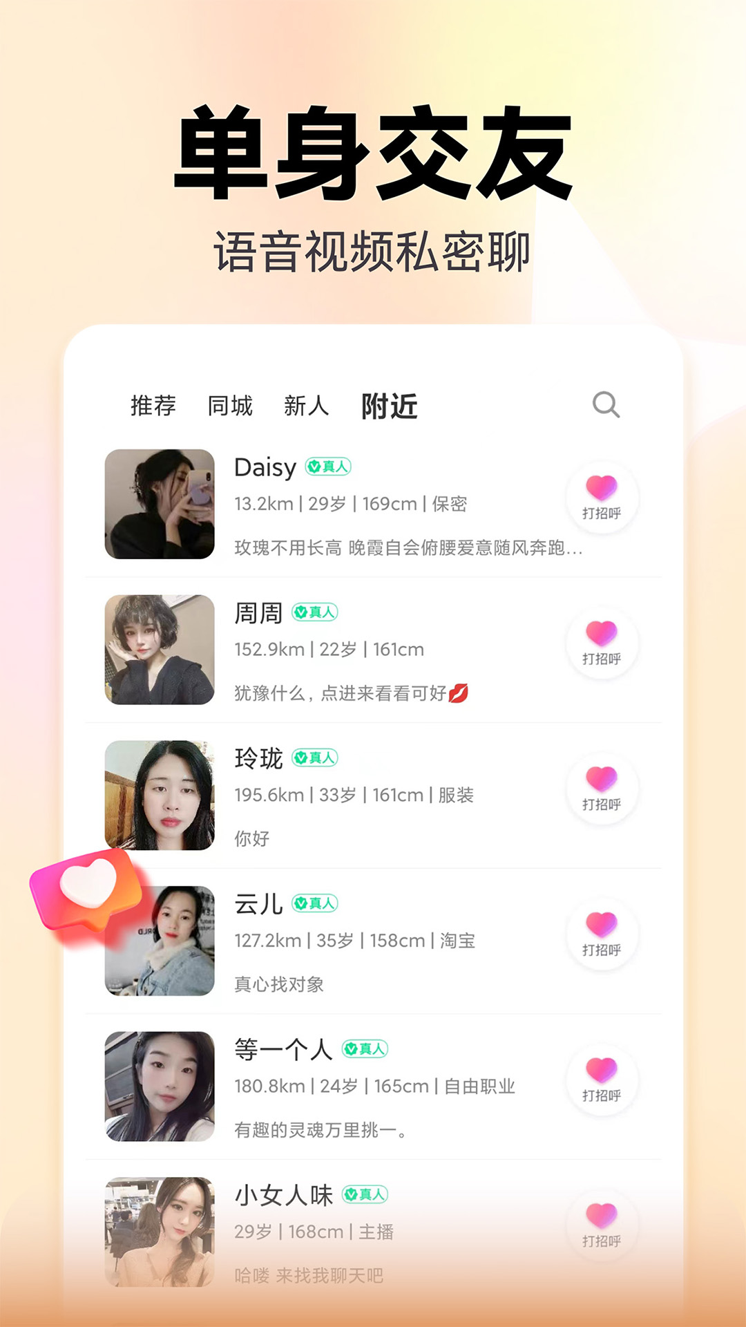 这个平台汇聚了数量众多的优质单身男女,它能够为用户匹配周边心仪之人。用户可以采用文字、语音、视频等多种形式,与自己喜欢的人展开聊天互动。