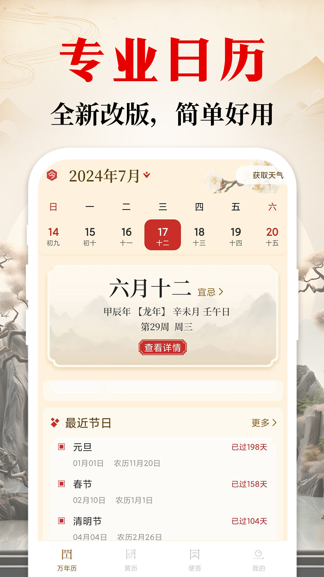 ②界面设计简洁,毫无冗余之感,并且彰显出浓郁的中国风,致力于打造优质且准确的中国日历万年历。