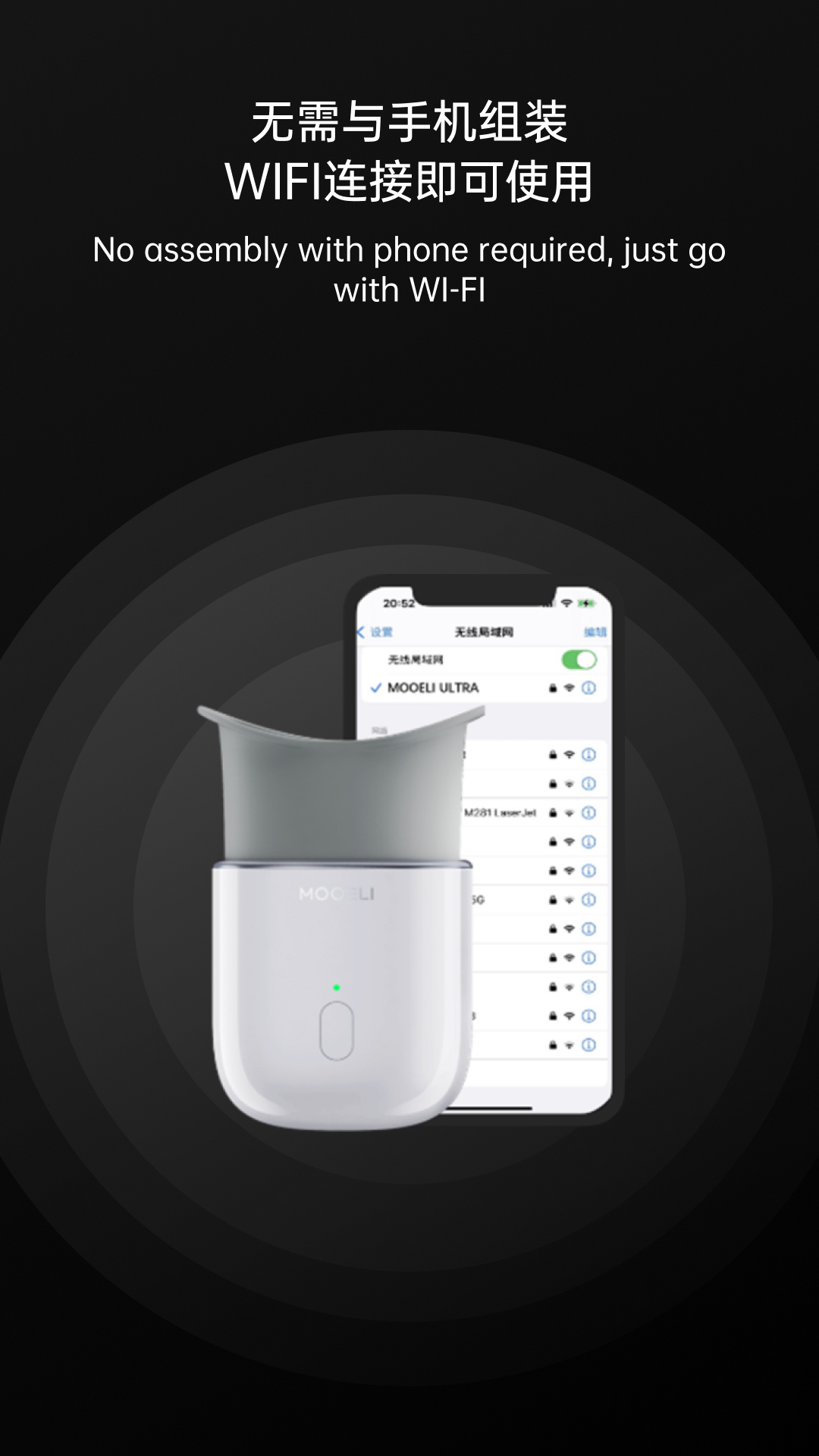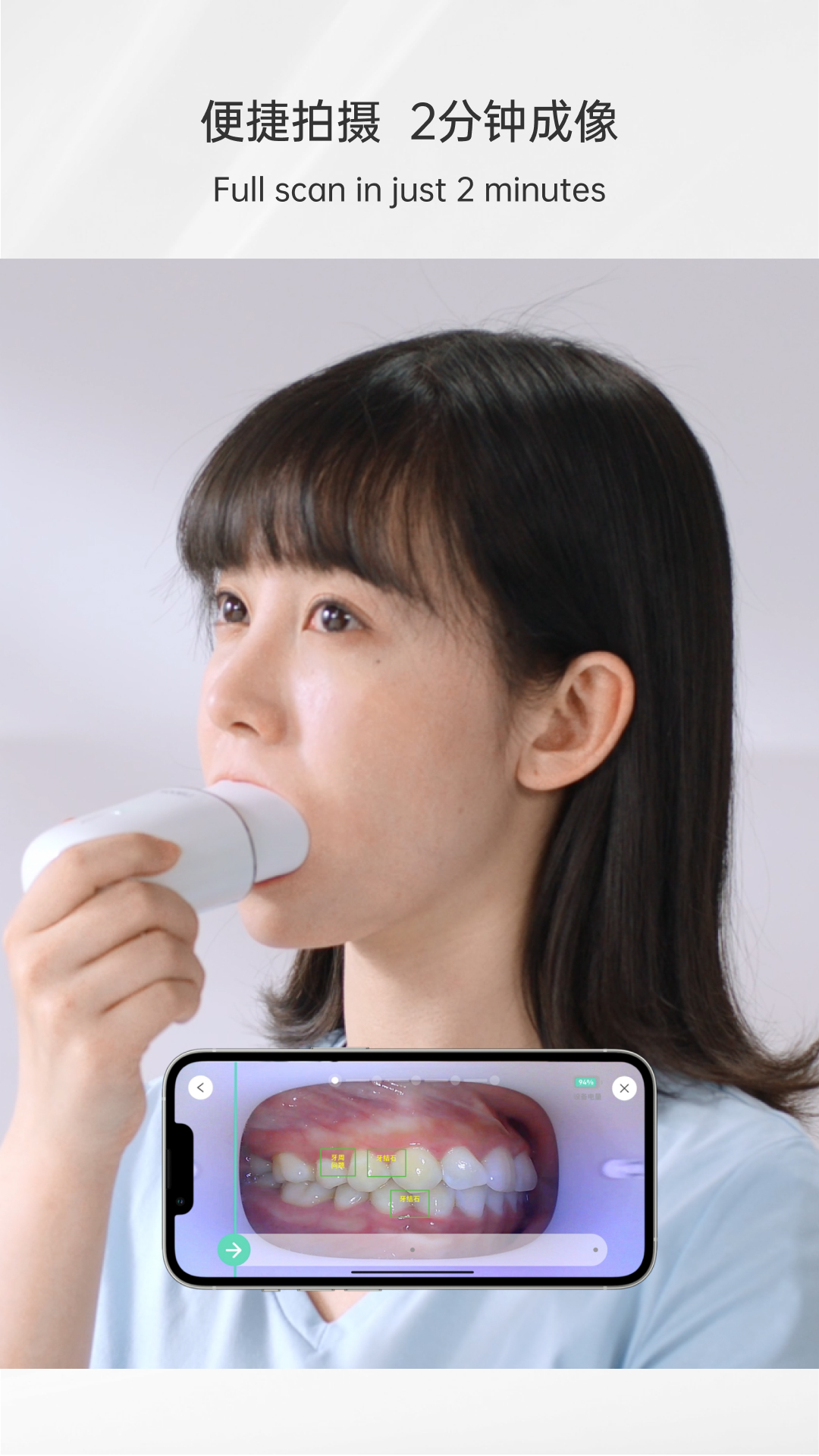 Mooeli家用口扫装置采用专利设计,在搭载了AI实时检测功能的手机应用的指引下,能够引导您轻松完成高质量的口腔内扫描。