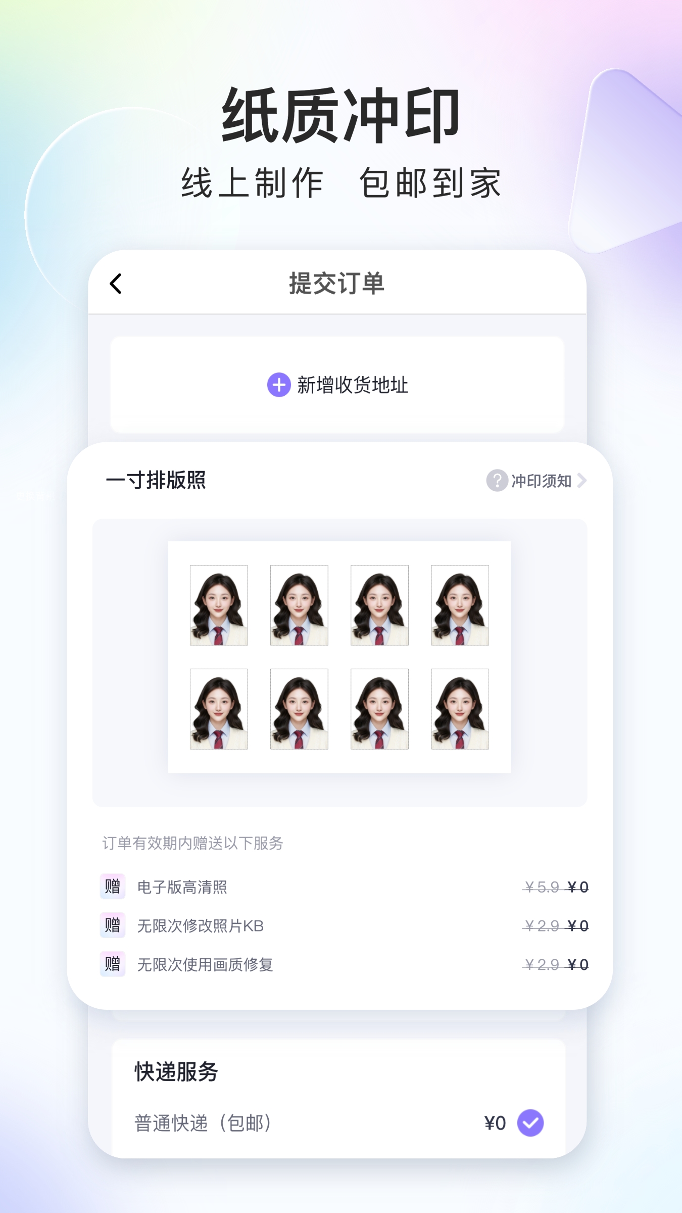 我们不仅提供电子版的证件照,还提供照片排版冲印服务,您无需出门,就能享受纸质证件照送货到家的贴心服务。