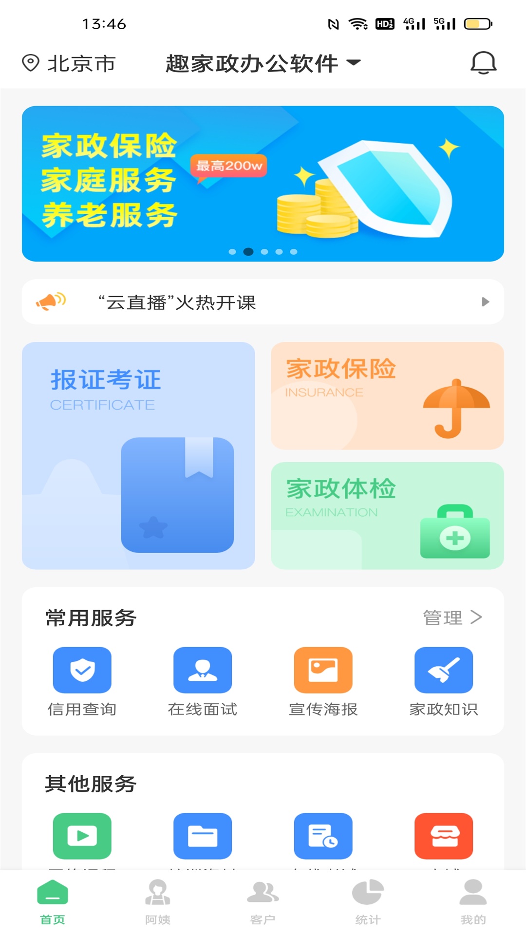 目前旗下趣家政系统APP,功能完善,操作简单。其实包含板块涉及员工管理、门店管理、阿姨管理、客户管理、家政证书、家政保险、网课、商城、电子签约、在线面试、海报/热文推广、定制化服务、背调、培训等各个板块。