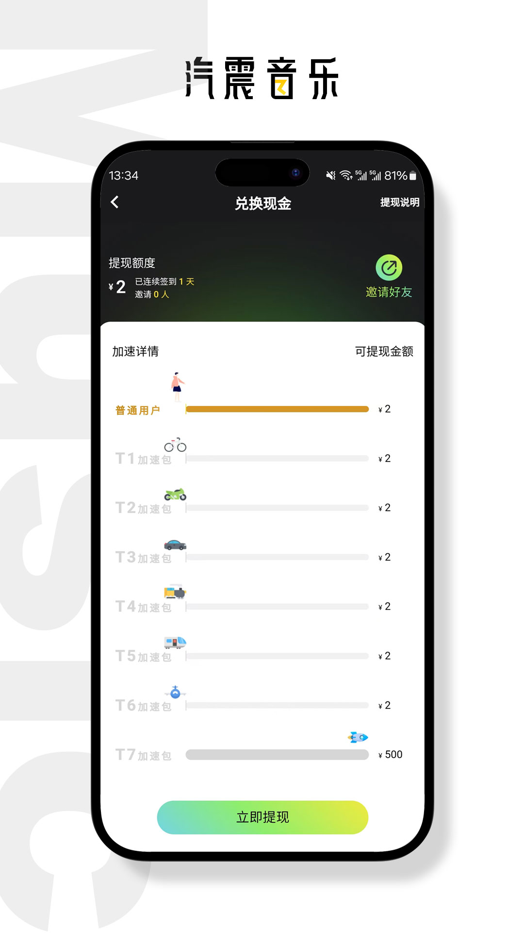 汽震音乐是一款应用程序,它专注于为用户带来丰富的音乐资源以及独特的互动体验。在这个应用里,用户可以尽情享受数量庞大的音乐作品。而且,用户还能够参与应用中的各类活动,通过这种方式有机会赢取红包奖励。此外,该应用还积极支持原创音乐人的成长与发展呢。